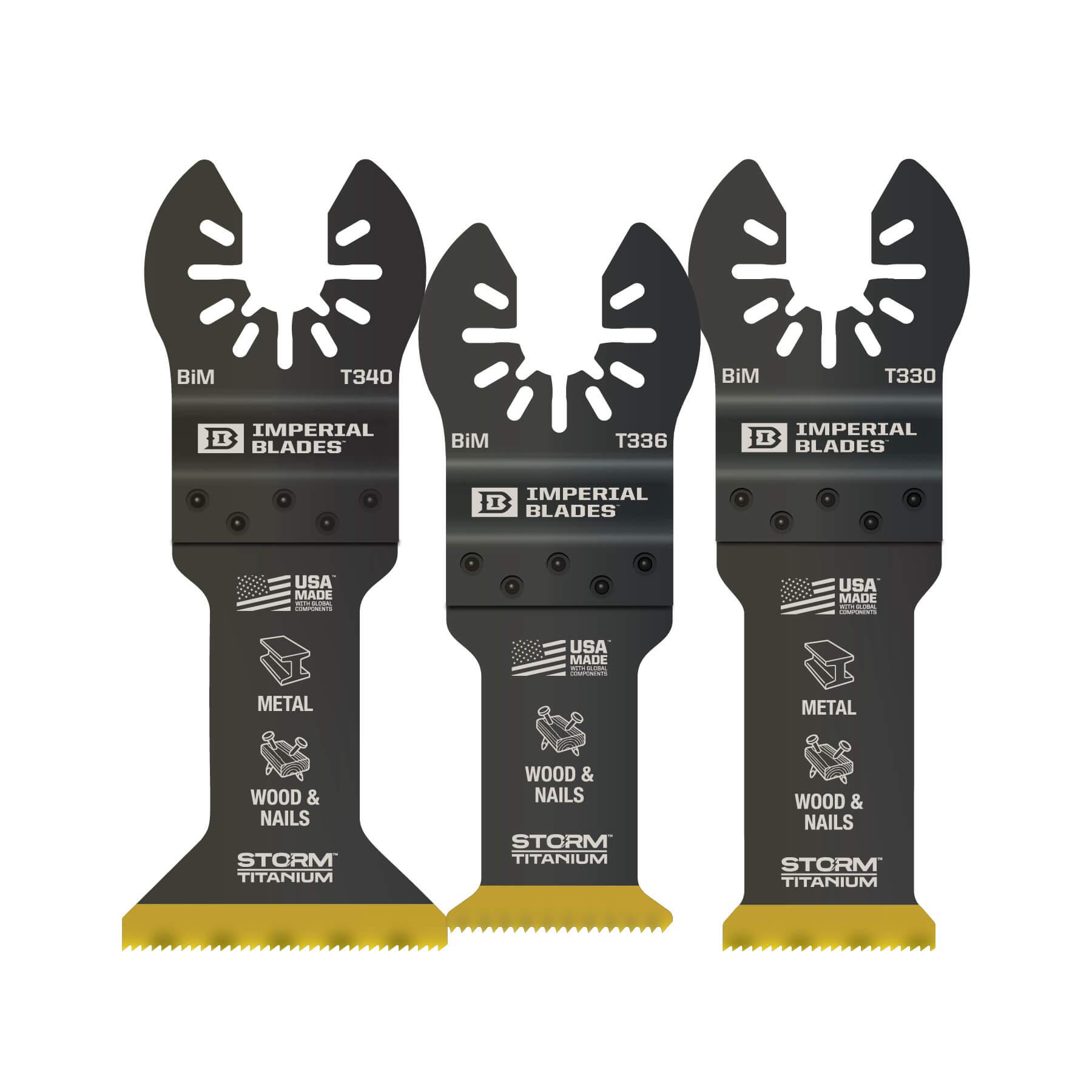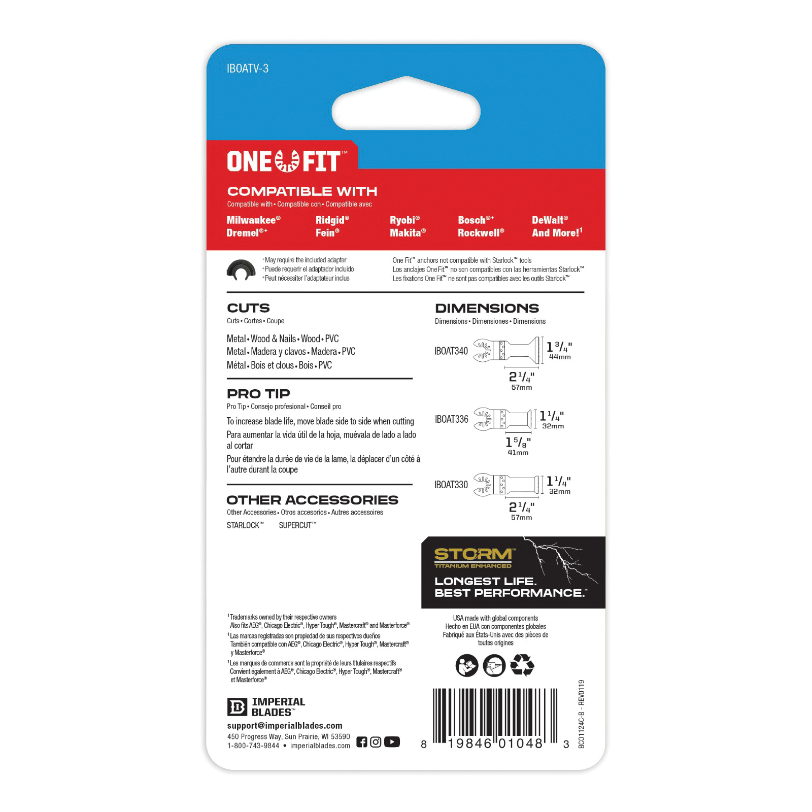 Imperial Blades One Fit™ Storm Titanium Metal/Wood Variety Pack includes 3 Storm Titanium bi-metal (BiM) blades: One Fit™ 1-1/8" and 1-3/4" Storm Titanium Bi-Metal Metal Blades (IBOAT330, IBOAT340) and One Fit™ 1-1/4" Storm Titanium Wood & Nails Blade (IBOAT336). These oscillating multi-tool blades are ideal for metal, wood & nails, wood, PVC applications, and more. Our One Fit™ anchor fits all major brands of non-Starlock tools: Milwaukee, Ridgid, Ryobi, DeWalt, Dremel, Rockwell, Makita, Craftsman, Porter-Cable, SKIL, WORX, and more! Dremel models MM45 & MM50 require the included adapter.