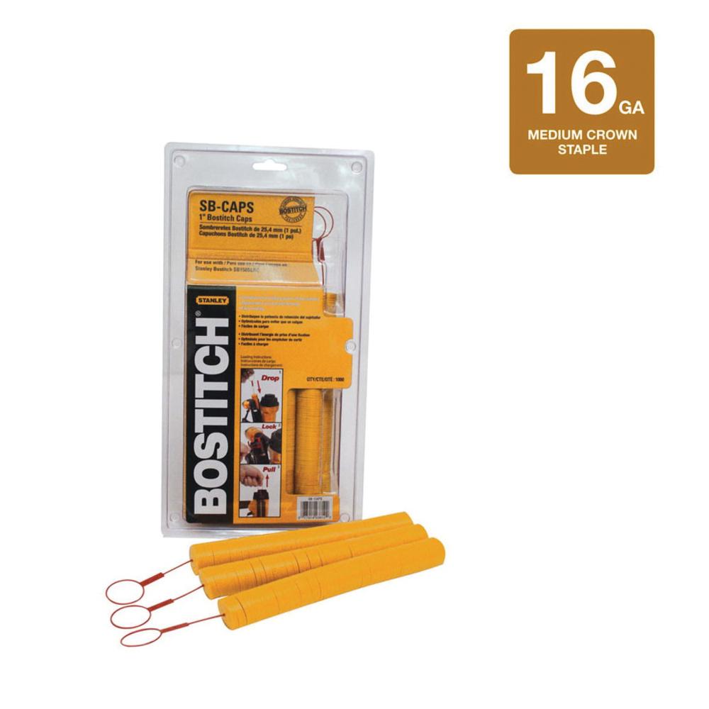 1 plastic caps. Eliminates pull-through when installing felt, house wrap and foam board insulation. For use with BOSTITCH cap stapler sb150slbc-1 (sku 273-5660) with 5/16 crown 18 GA. Staples and BOSTITCH cap stapler n66bc-1(sku 172-6561) with 15 degree Coil Siding Nails.