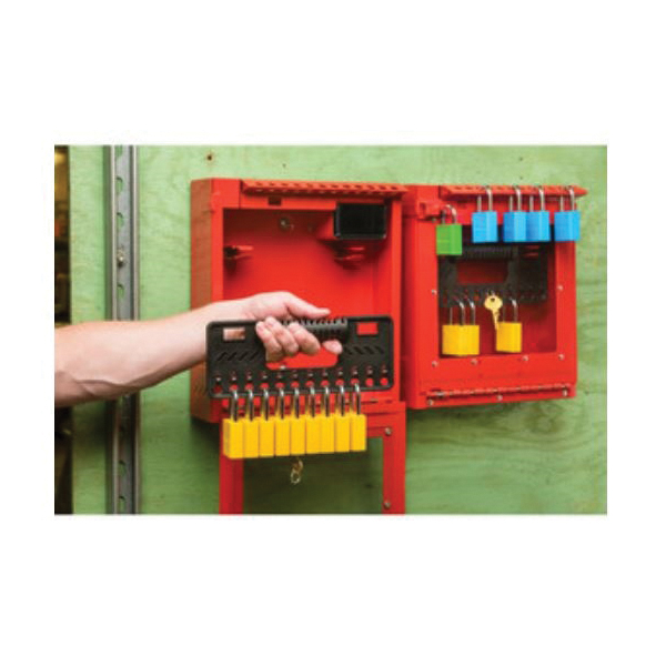 - Includes removable lock caddy for easy transportation of equipment locks to isolation points during lockout