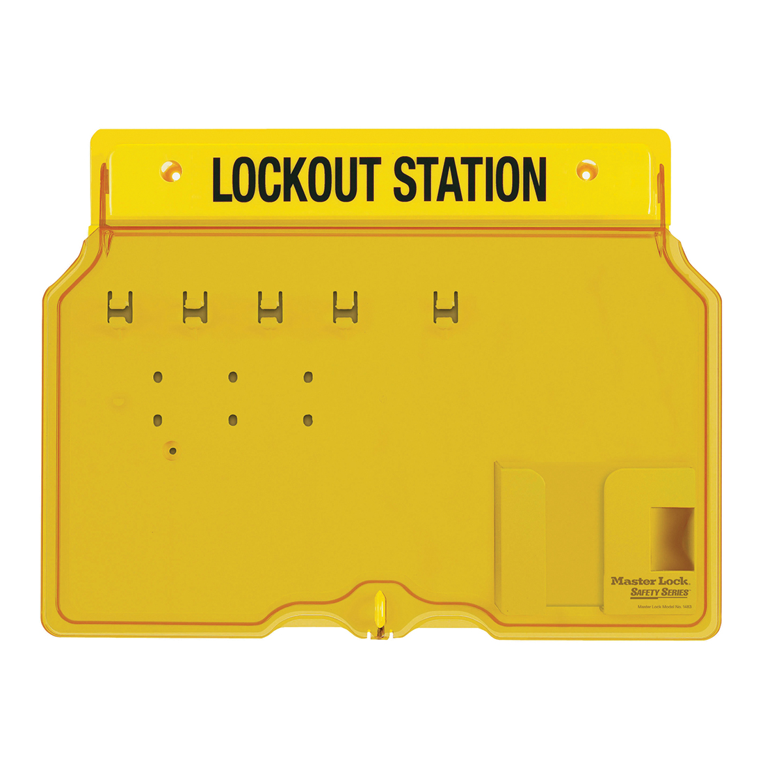 4-Lock Padlock Station, unfilled. Add safety padlocks of your choice. Includes translucent, lockable cover to protect contents from dust and debris. Trilingual labels provided for optional application. Station measures 12-1/4in high x 16in wide x 1-3/4in deep (311mm x 406mm x 44mm).