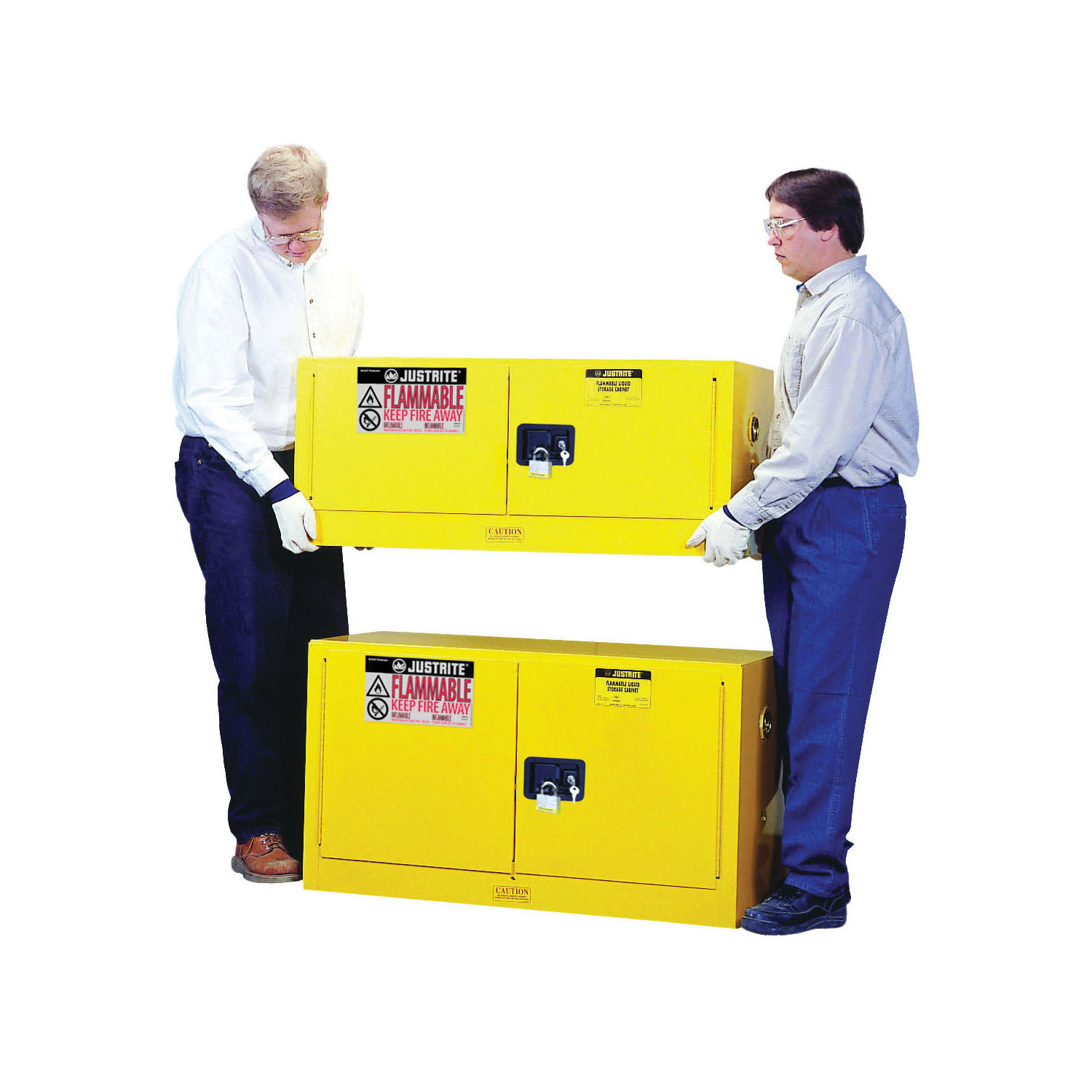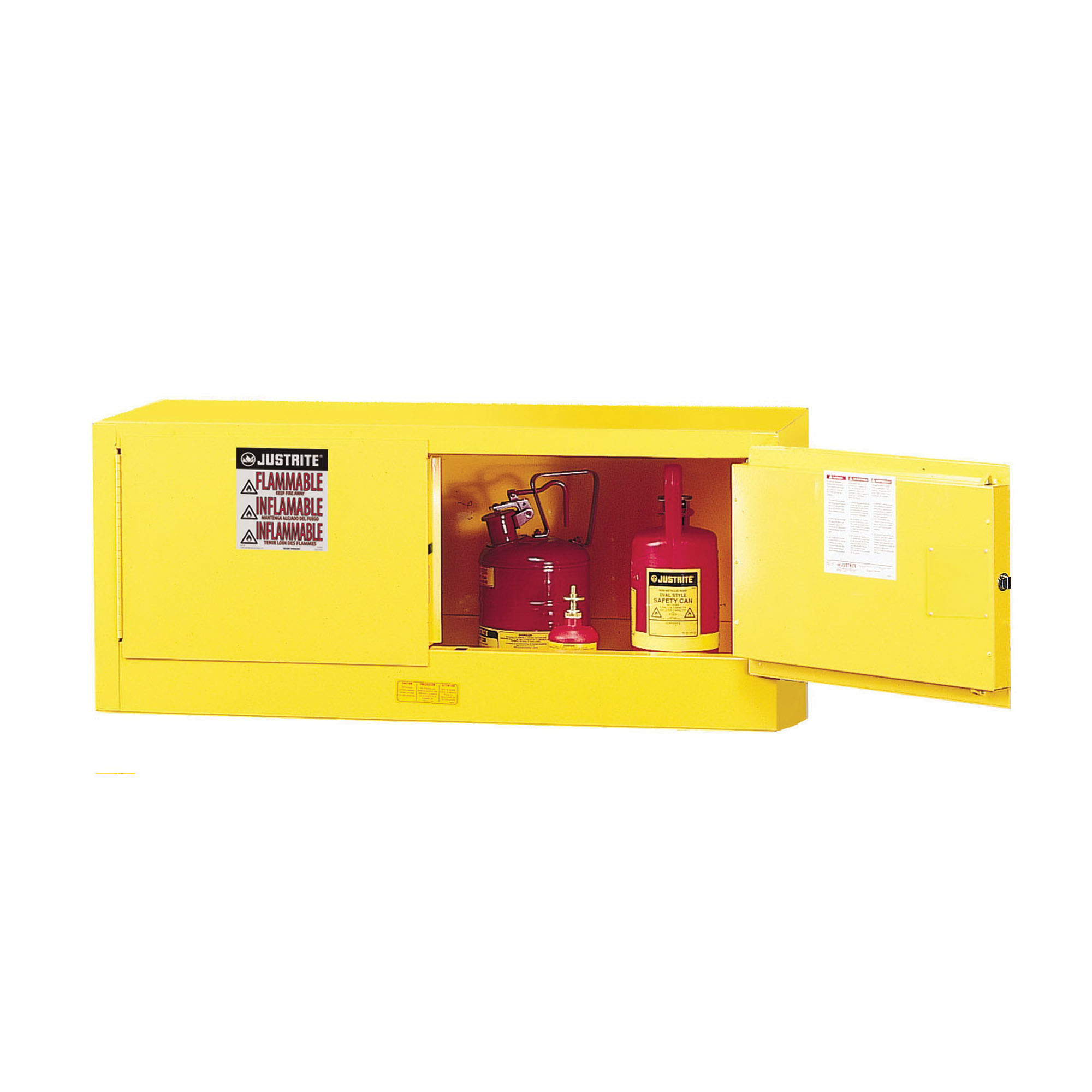 Justrite® 894500 Flammable Safety Cabinet, 45 gal Capacity, 65 in H x 43 in W x 18 in D, Manual Close Door, 2 Doors, 2 Shelves, Cold Rolled Steel, Yellow