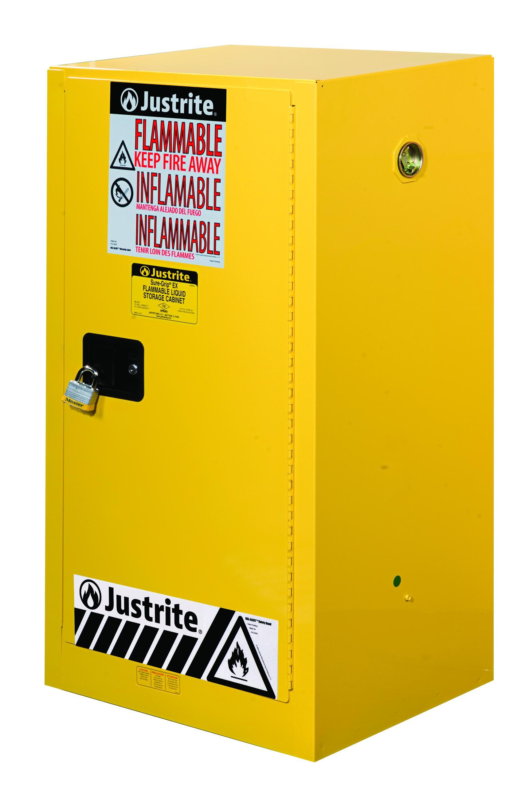 Protect workers, reduce fire risks, and improve productivity by storing flammable fuels and chemicals in code-compliant safety cabinets. Designed to meet OSHA and NFPA 30 standards, Sure-Grip® EX cabinets are constructed of sturdy 1 mm thick double-wall, welded steel with 38 mm of insulating air space for fire resistance. High-performance, self-latching doors close easily and securely for maximum protection under fire conditions. Fail-safe closing mechanism ensures three-point stainless steel bullet latching system works every time. For added security, U-Loc™ handle comes with a cylinder lock and key set or accepts an optional padlock. Haz-Alert™ reflective warning labels are highly visible under fire conditions or during power outages when illuminated with a flashlight. Patented SpillSlope® galvanized steel shelves direct spills to back and bottom of a 51 mm leakproof bottom sump. They adjust to 76 mm centres for versatile storage. Cabinets also feature dual vents with flame arresters, four adjustable self-levelling feet, grounding connector and trilingual warning label. Durable lead-free epoxy/polyester powder-coat finish provides excellent chemical resistance. These cabinets are FM-approved and come with a ten-year warranty. Available in manual close or self-close. Available in grey or red on request. For the safe storage of flammable liquids to avoid risk of potential fire hazards and chemical spills in industries like chemical manufacturing, petrochemical and laboratories.