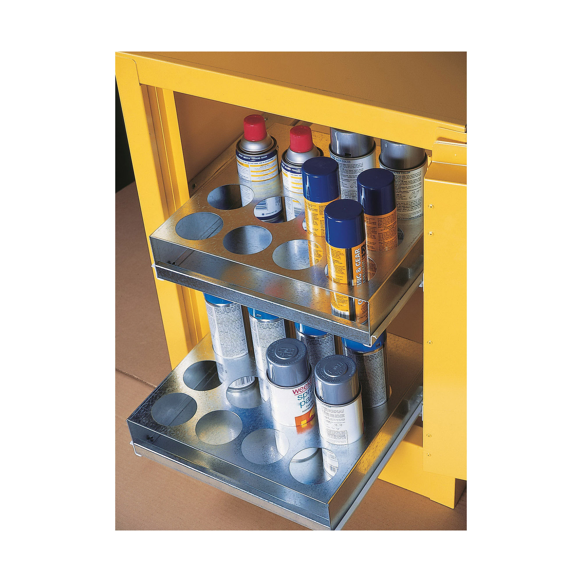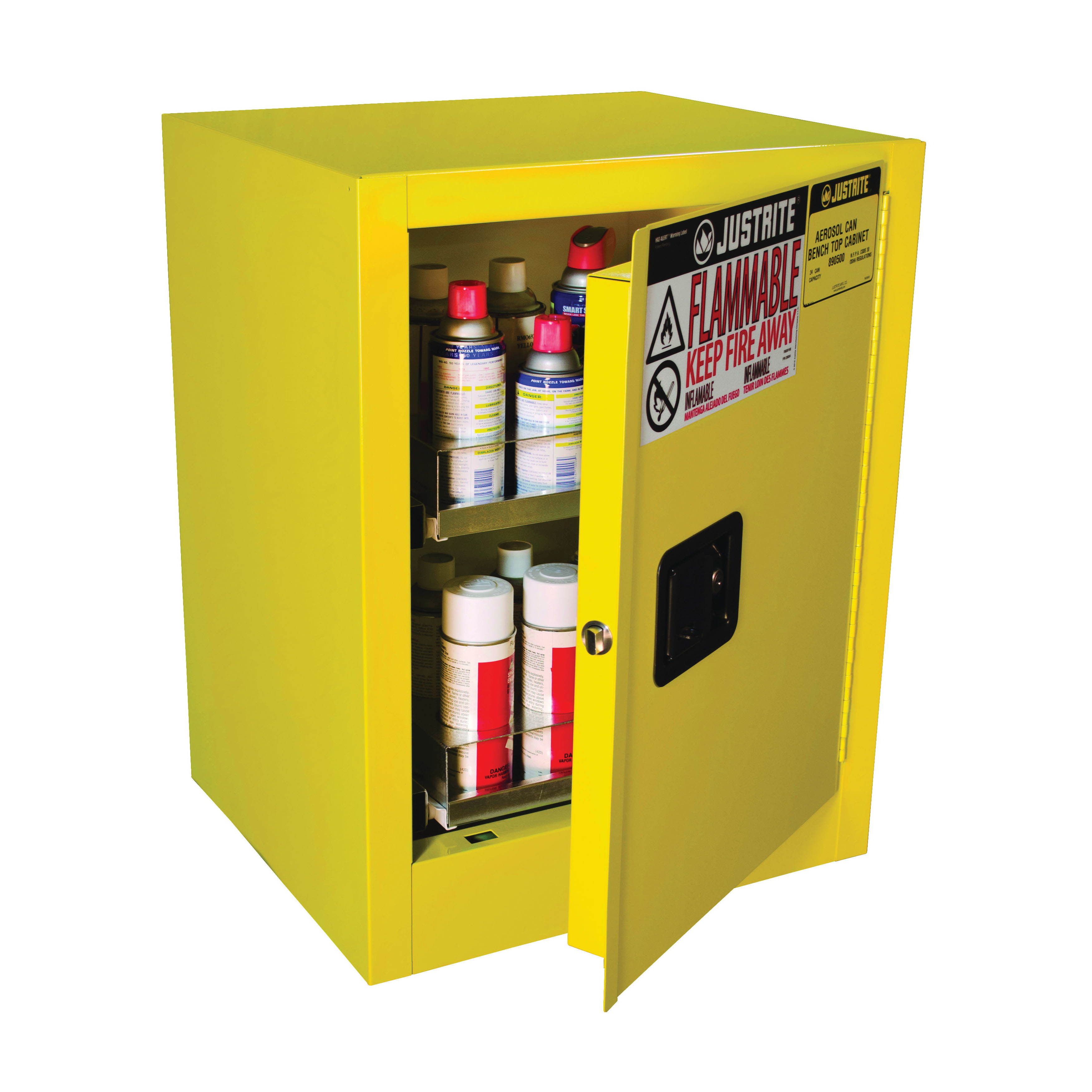 Justrite’s Aerosol Can Benchtop Safety Cabinet fits virtually anywhere for hassle-free organization of up to twenty-four aerosol cans. Cabinet features 24-gauge galvanized steel roll-out shelves with “easy-glide” plastic rollers and stop guard protection. Two fixed position shelves, with twelve 2¾ in. (70mm) diameter openings, accept cans up to 10 in. (254mm) tall and are removable for easy cleaning. These cabinets have all the great features and benefits of our classic cabinets as outlined below. For the safe storage of aerosol cans to avoid the risk of potential fire and hazards.