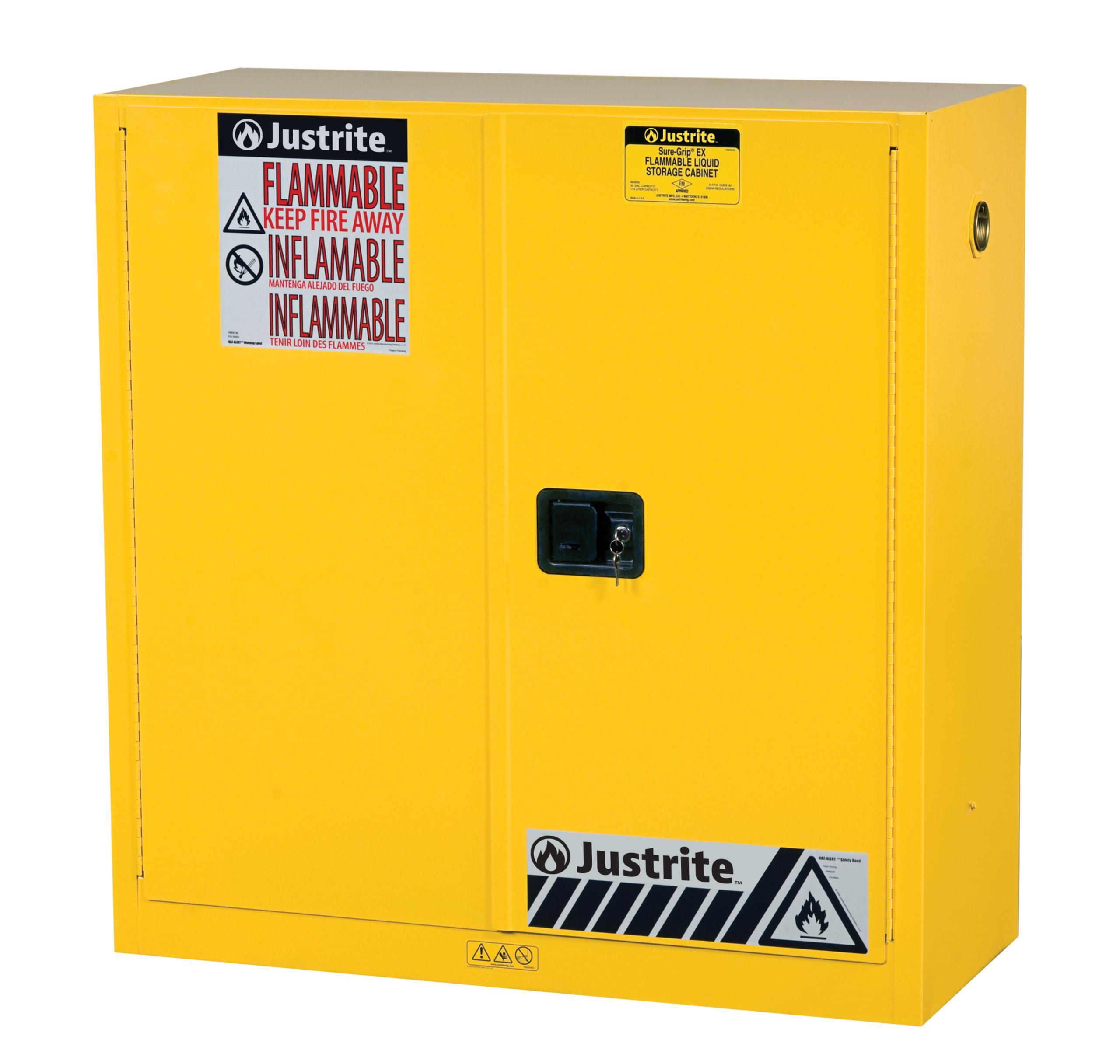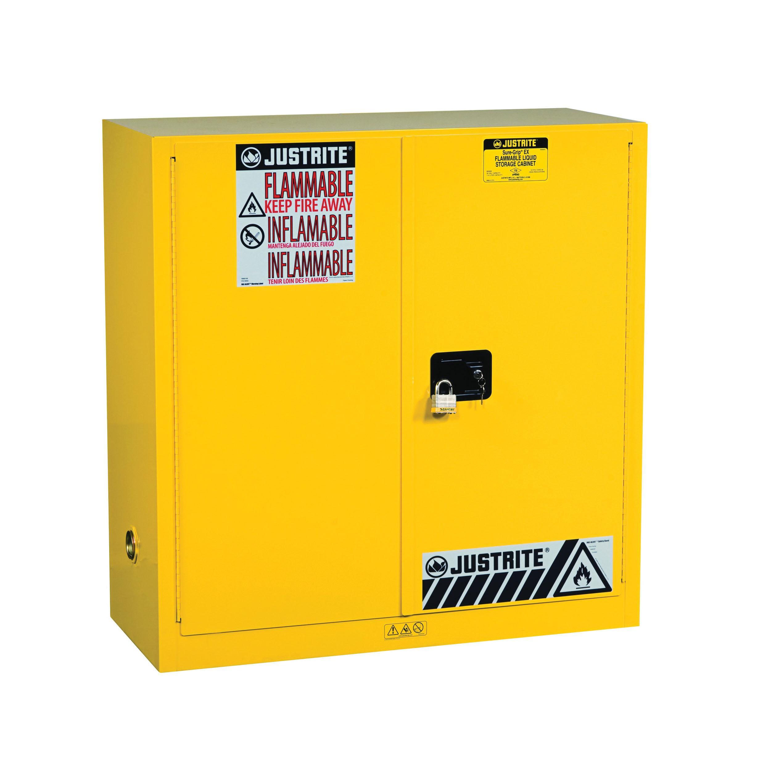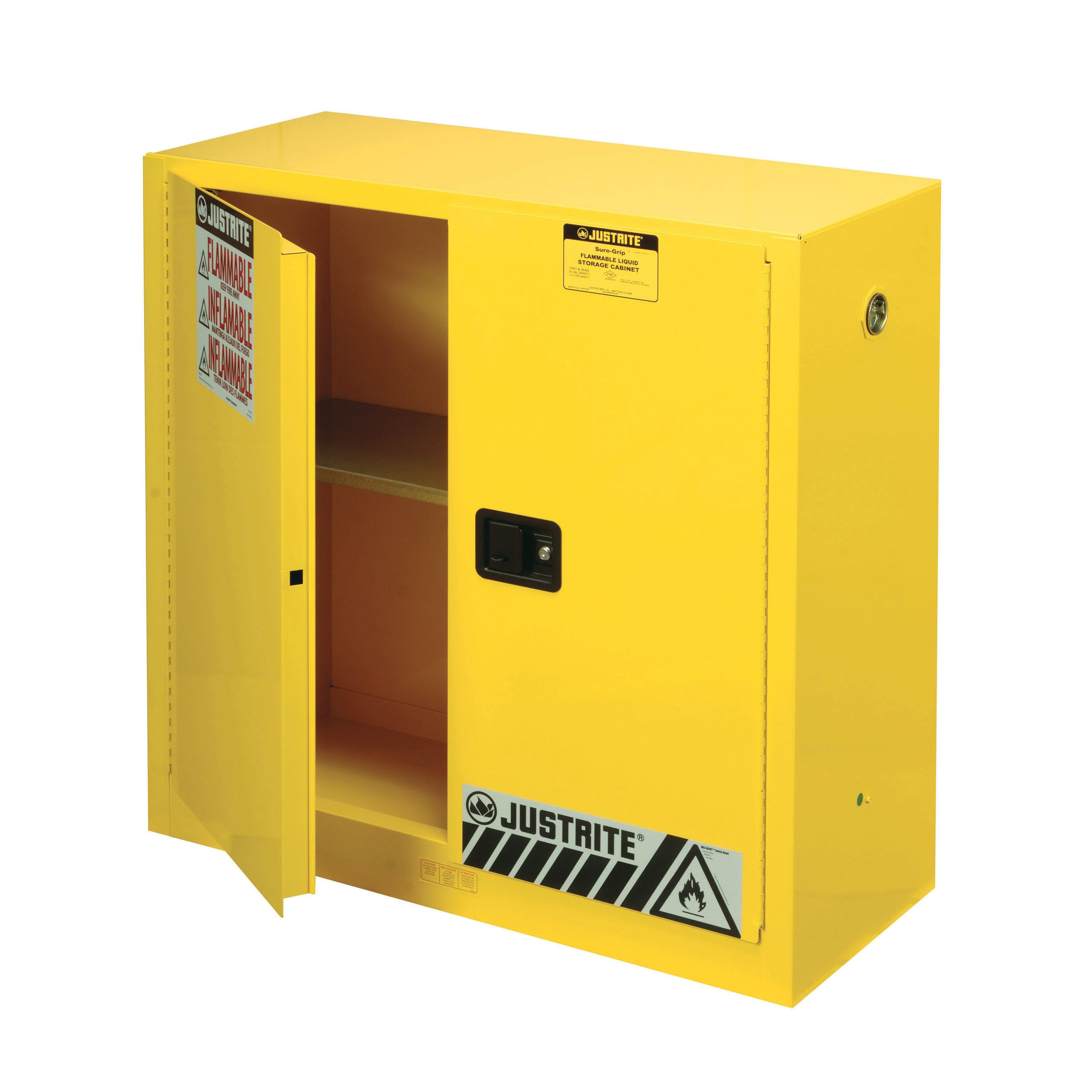 Protect workers, reduce fire risks, and improve productivity by storing flammable fuels and chemicals in code-compliant safety cabinets. Designed to meet OSHA and NFPA 30 standards, Sure-Grip® EX cabinets are constructed of sturdy 1 mm thick double-wall, welded steel with 38 mm of insulating air space for fire resistance. High-performance, self-latching doors close easily and securely for maximum protection under fire conditions. Fail-safe closing mechanism ensures three-point stainless steel bullet latching system works every time. For added security, U-Loc™ handle comes with a cylinder lock and key set or accepts an optional padlock. Haz-Alert™ reflective warning labels are highly visible under fire conditions or during power outages when illuminated with a flashlight. Patented SpillSlope® galvanized steel shelves direct spills to back and bottom of a 51 mm leakproof bottom sump. They adjust to 76 mm centres for versatile storage. Cabinets also feature dual vents with flame arresters, four adjustable self-levelling feet, grounding connector and trilingual warning label. Durable lead-free epoxy/polyester powder-coat finish provides excellent chemical resistance. These cabinets are FM-approved and come with a ten-year warranty. Available in manual close or self-close. Available in grey or red on request. For the safe storage of flammable liquids to avoid risk of potential fire hazards and chemical spills in industries like chemical manufacturing, petrochemical and laboratories.