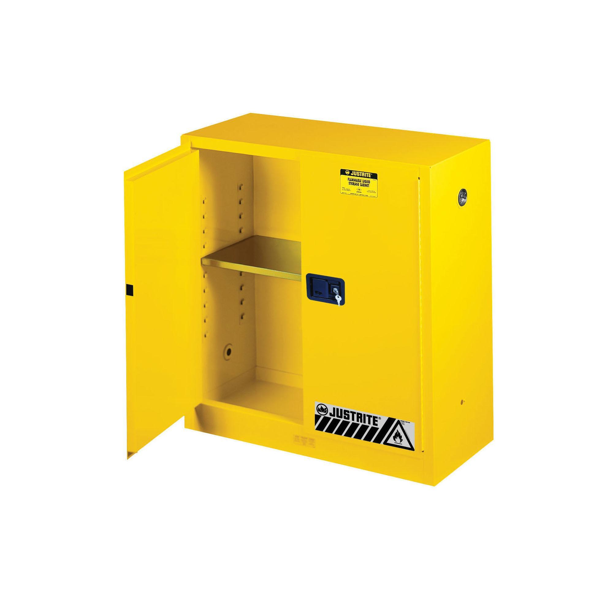 Justrite® 894500 Flammable Safety Cabinet, 45 gal Capacity, 65 in H x 43 in W x 18 in D, Manual Close Door, 2 Doors, 2 Shelves, Cold Rolled Steel, Yellow