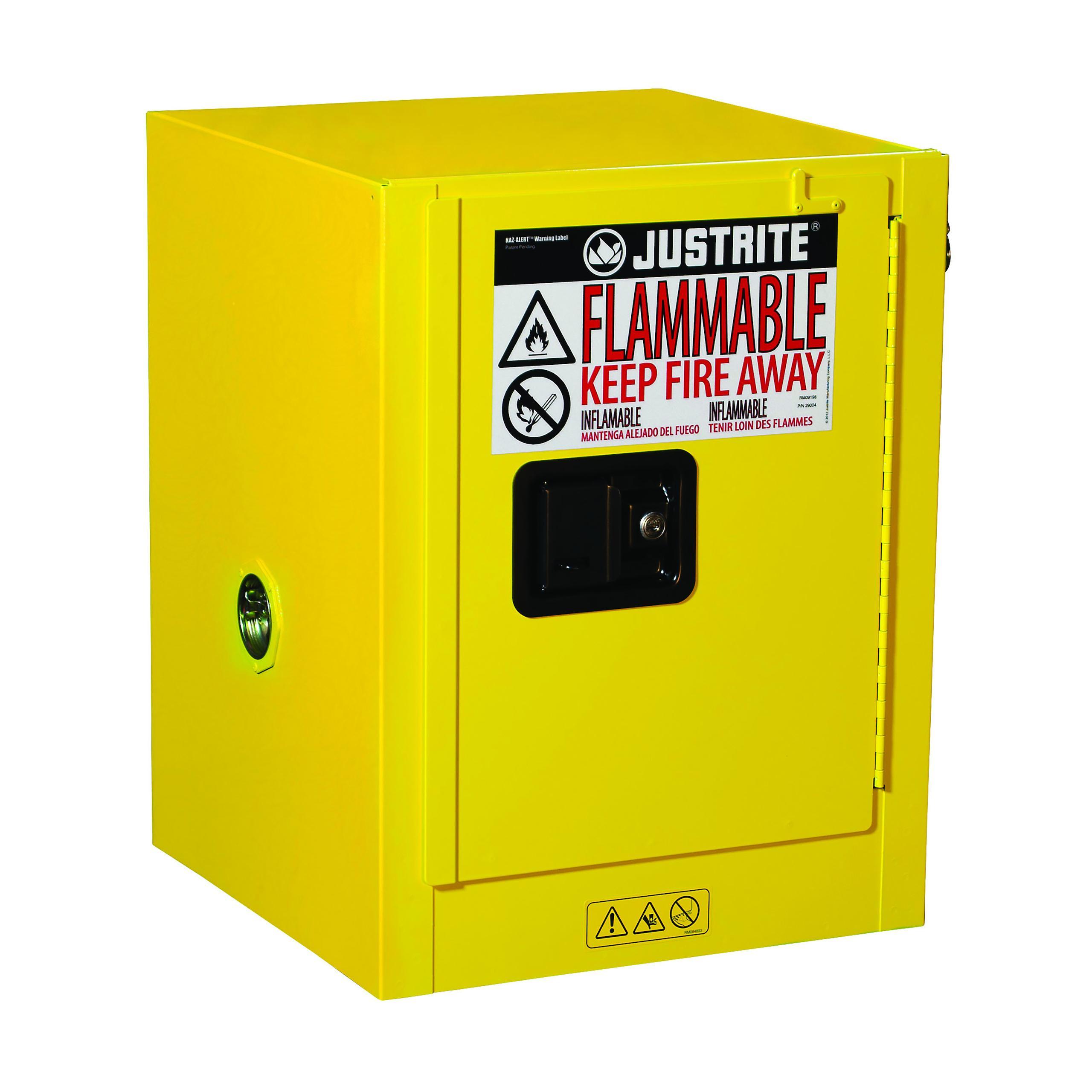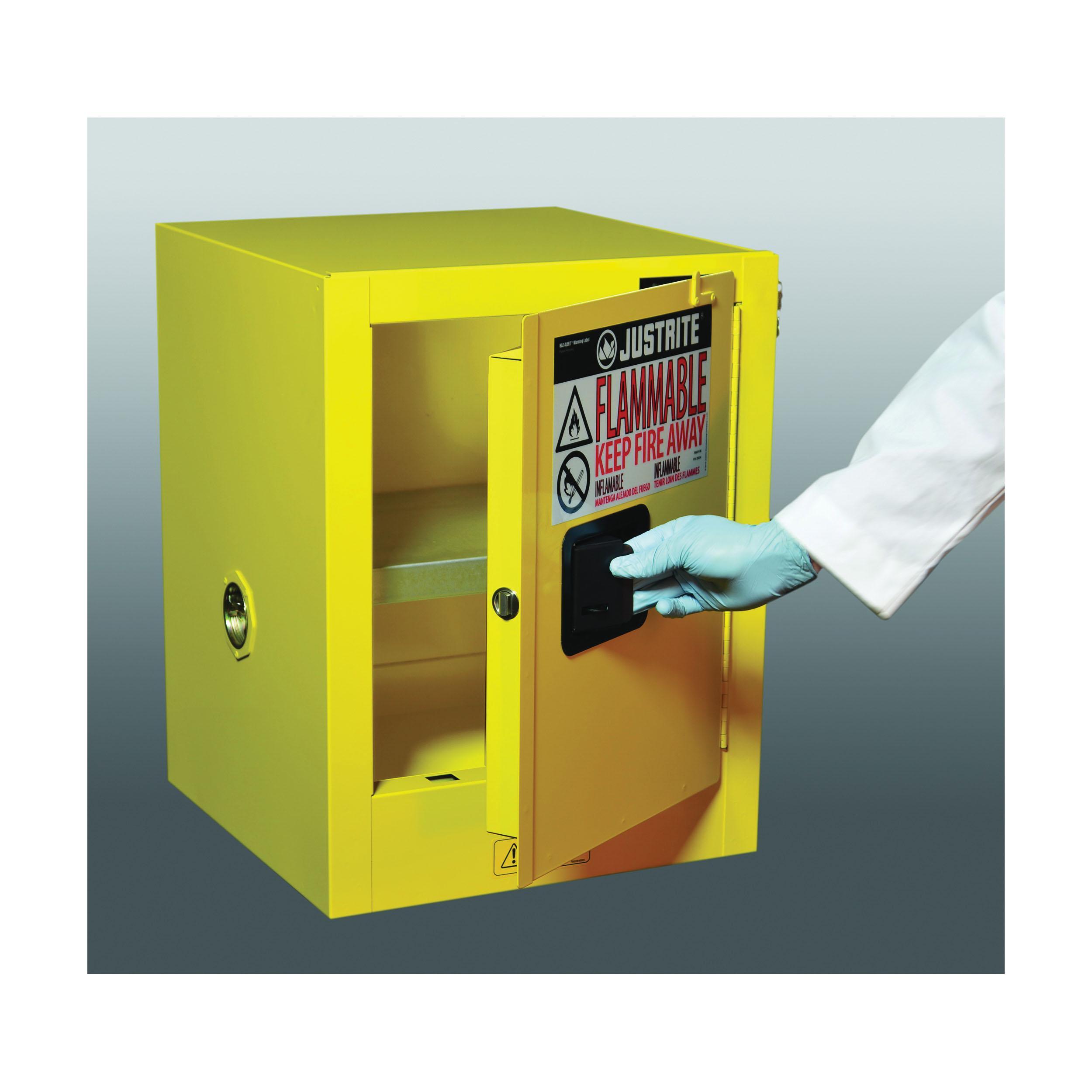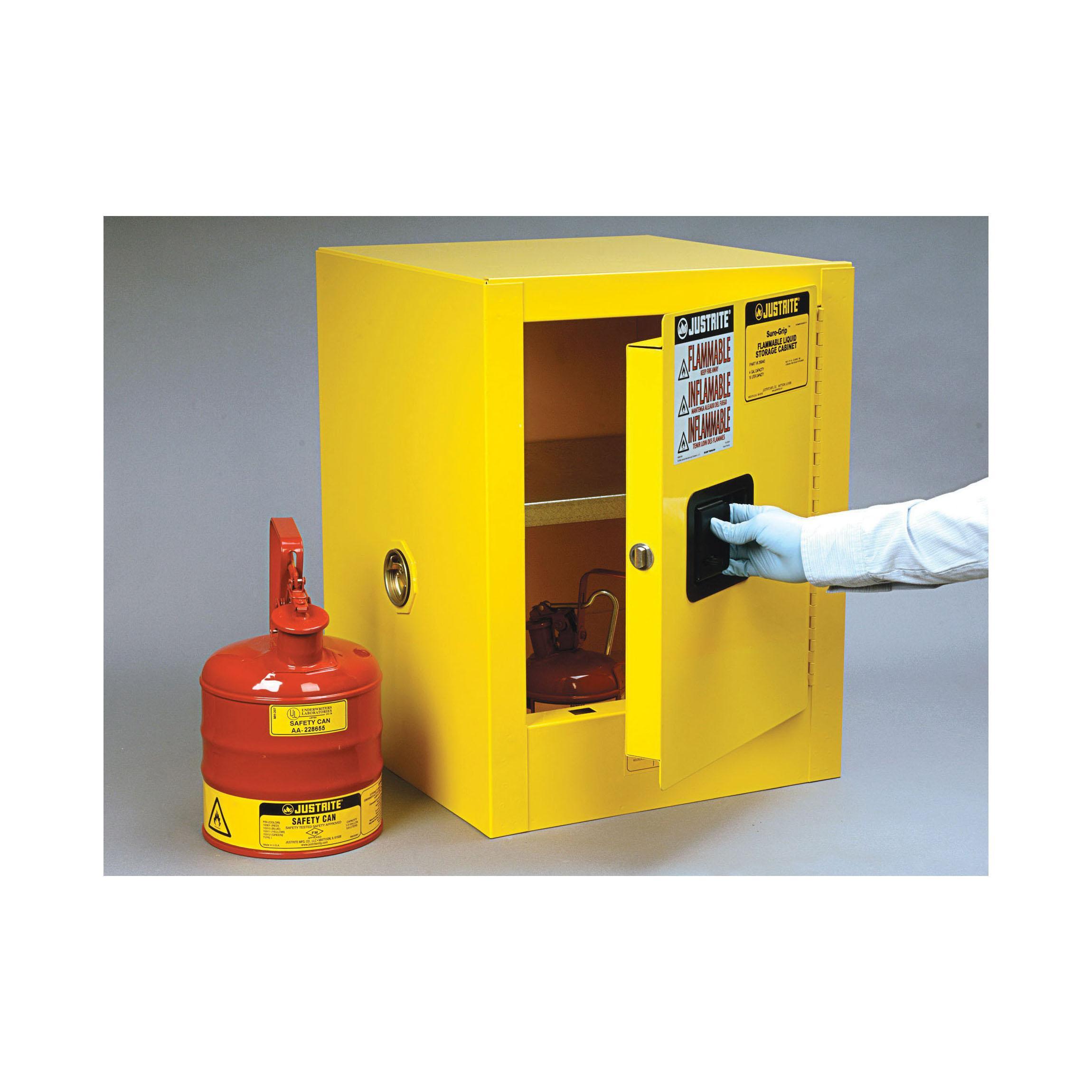 Justrite® 890400 Sure-Grip® EX Countertop Flammable Safety Cabinet, 4 gal Capacity, Recessed Paddle Handle, 22 in H x 17 in W x 17 in D, Manual Close Door, 1 Doors, 1 Shelves, Cold Rolled Steel, Yellow