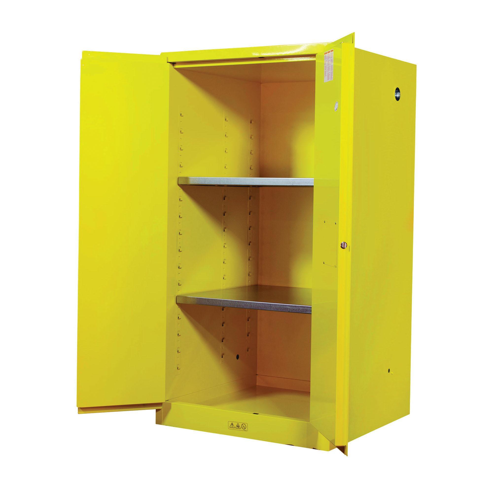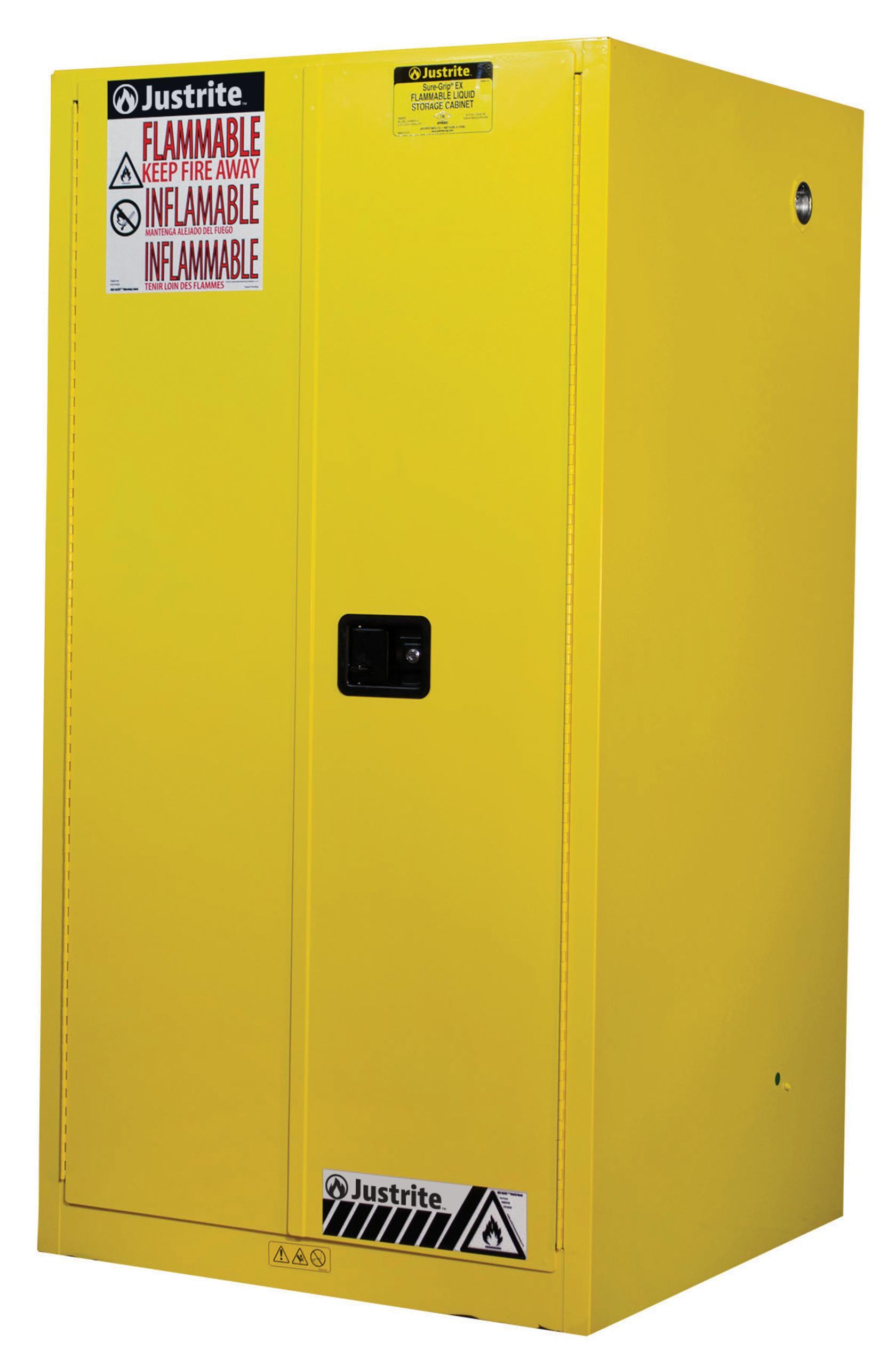 Protect workers, reduce fire risks, and improve productivity by storing flammable fuels and chemicals in code-compliant safety cabinets. Designed to meet OSHA and NFPA 30 standards, Sure-Grip® EX cabinets are constructed of sturdy 1 mm thick double-wall, welded steel with 38 mm of insulating air space for fire resistance. High-performance, self-latching doors close easily and securely for maximum protection under fire conditions. Fail-safe closing mechanism ensures three-point stainless steel bullet latching system works every time. For added security, U-Loc™ handle comes with a cylinder lock and key set or accepts an optional padlock. Haz-Alert™ reflective warning labels are highly visible under fire conditions or during power outages when illuminated with a flashlight. Patented SpillSlope® galvanized steel shelves direct spills to back and bottom of a 51 mm leakproof bottom sump. They adjust to 76 mm centres for versatile storage. Cabinets also feature dual vents with flame arresters, four adjustable self-levelling feet, grounding connector and trilingual warning label. Durable lead-free epoxy/polyester powder-coat finish provides excellent chemical resistance. These cabinets are FM-approved and come with a ten-year warranty. Available in manual close or self-close. Available in grey or red on request. For the safe storage of flammable liquids to avoid risk of potential fire hazards and chemical spills in industries like chemical manufacturing, petrochemical and laboratories.