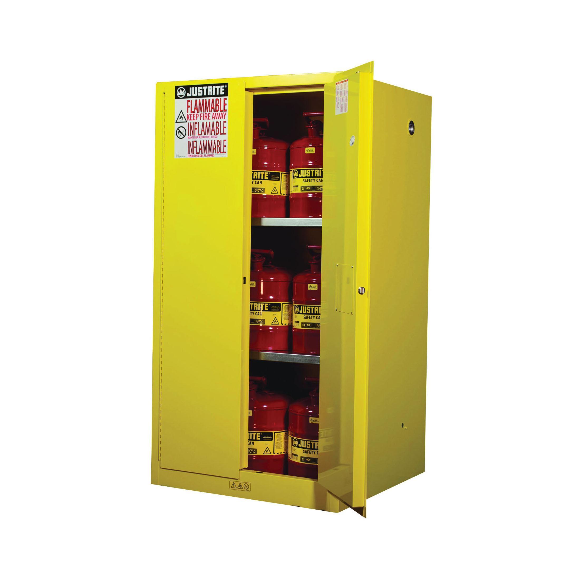 Justrite® 896000 Sure-Grip® EX Classic Flammable Safety Cabinet, 60 gal Capacity, Recessed Paddle Handle, 65 in H x 34 in W x 34 in D, Manual Close Door, 2 Doors, 2 Shelves, Cold Rolled Steel, Yellow