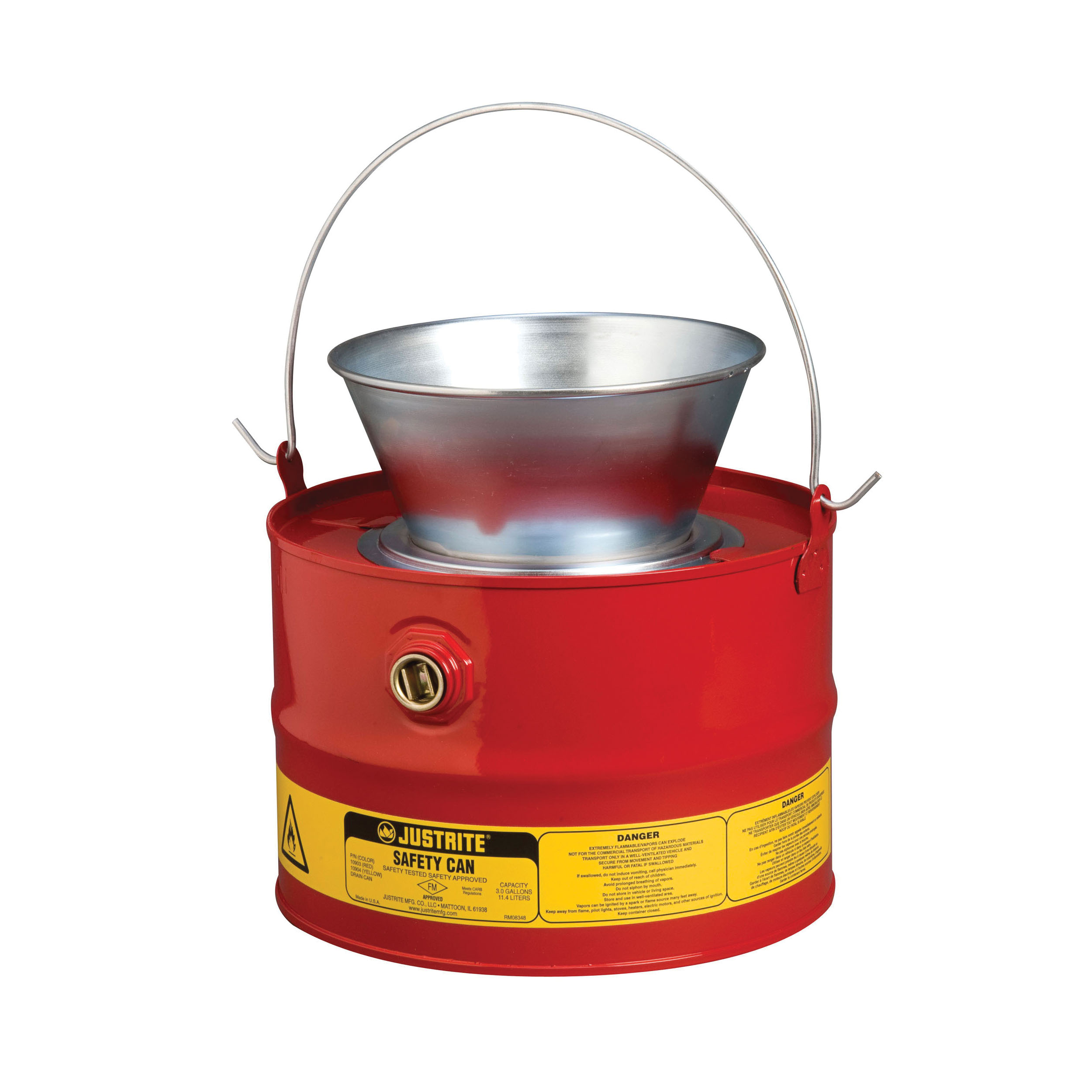 Justrite® 10903 Drain Can With Plated Steel Funnel, 3 gal Capacity, 11-5/8 in Dia, 12-1/4 in H, Steel, Red, FM Approved