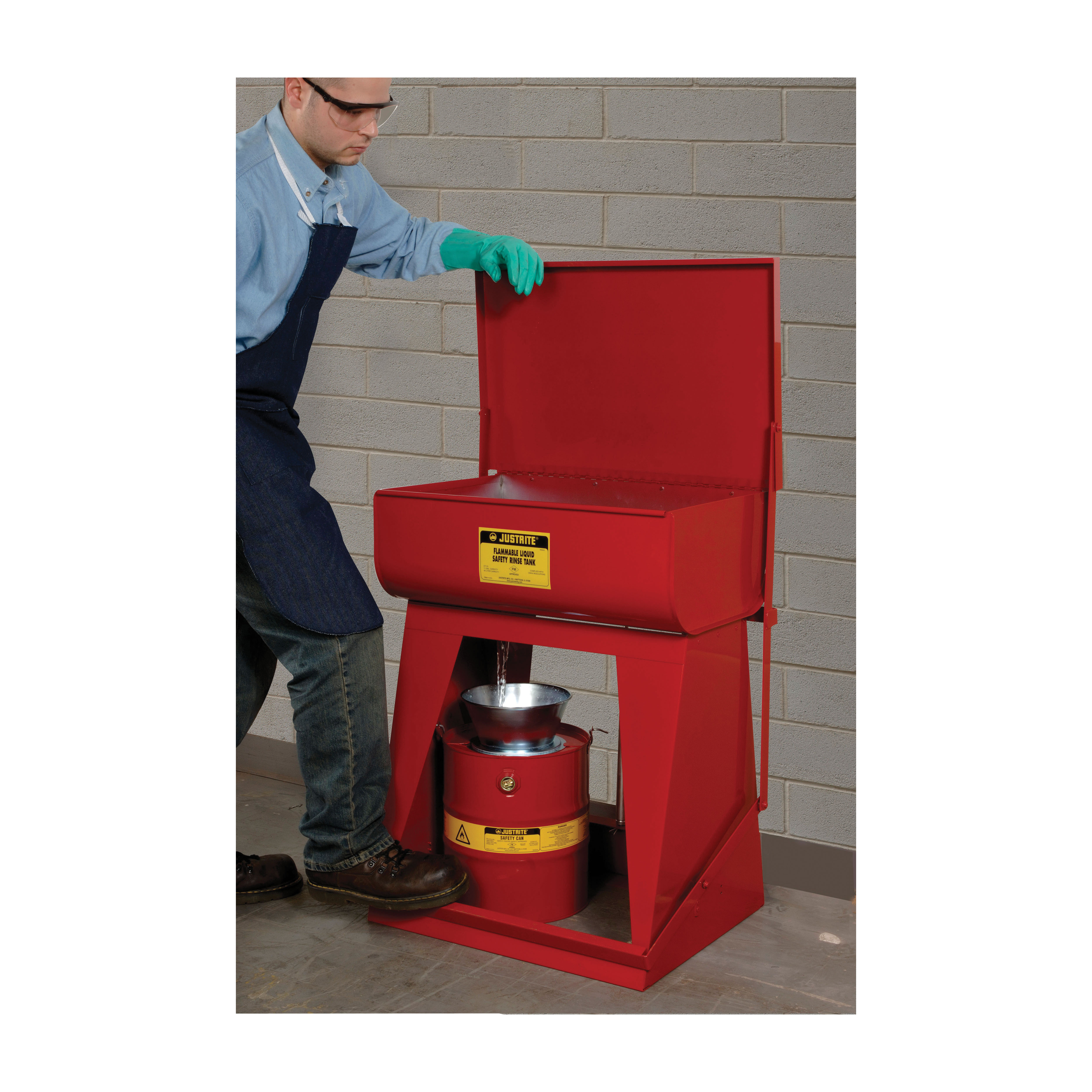 Easily and safely collect used solvents from parts washing equipment with a Justrite drain can. Wide-mouth funnel catches drainage with no spill, no mess. The removable funnel is plated steel. Built-in flame arrester keeps fire from contents. A 3/4" threaded plug allows safe disposal of waste liquids from the drain can into a permanent receptacle. Optional drain can cover fits on top of the funnel to keep out dirt. Safely collect waste liquids from parts washing equipment with no spills or mess. Features a wide-mouth, 225 mm plated steel funnel that catches drainage – position under rinse tanks to collect used solvents Built-in flame arrester on funnel protects liquid contents from ignition sources 19 mm threaded plug permits disposal of waste liquids into a permanent receptacle Removable funnel for easy cleaning Optional drain can cover for funnel top keeps dirt out Used to create hassle-free disposal of used solvents and waste liquids to limit spills with a built-in flame arrestor to enhance safety.