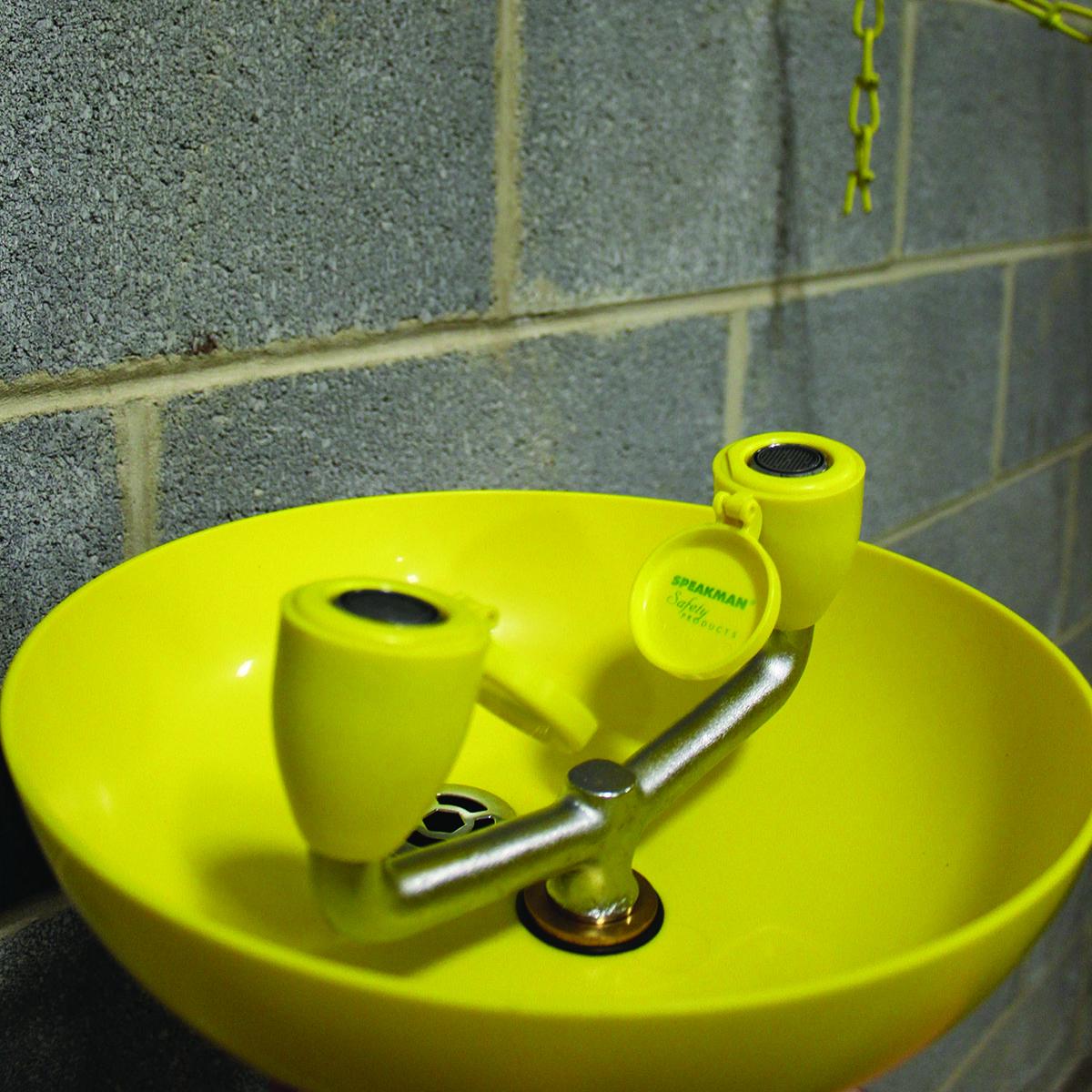 Speakman® traditional series round bowl eye/face wash stations provide the highest level of performance. All traditional series eye/face wash stations feature dual spray heads with automatic flow controls and flip top dust covers. The aerated water flow, a Speakman® signature feature allows soft flowing water to provide a wider coverage, cleaning full facial areas. Additionally traditional eye/face wash stations are equipped with a stay open ball valve activated by a paddle handle allowing hands free operation once the eye/face wash has been activated. The Speakman® Traditional Series SE-495 Eye and Face Wash Plastic Bowl Wall Mount System is a wall mounted unit with a yellow plastic bowl meets the ANSI/ISEA Z385.1 standard and OSHA compliance.