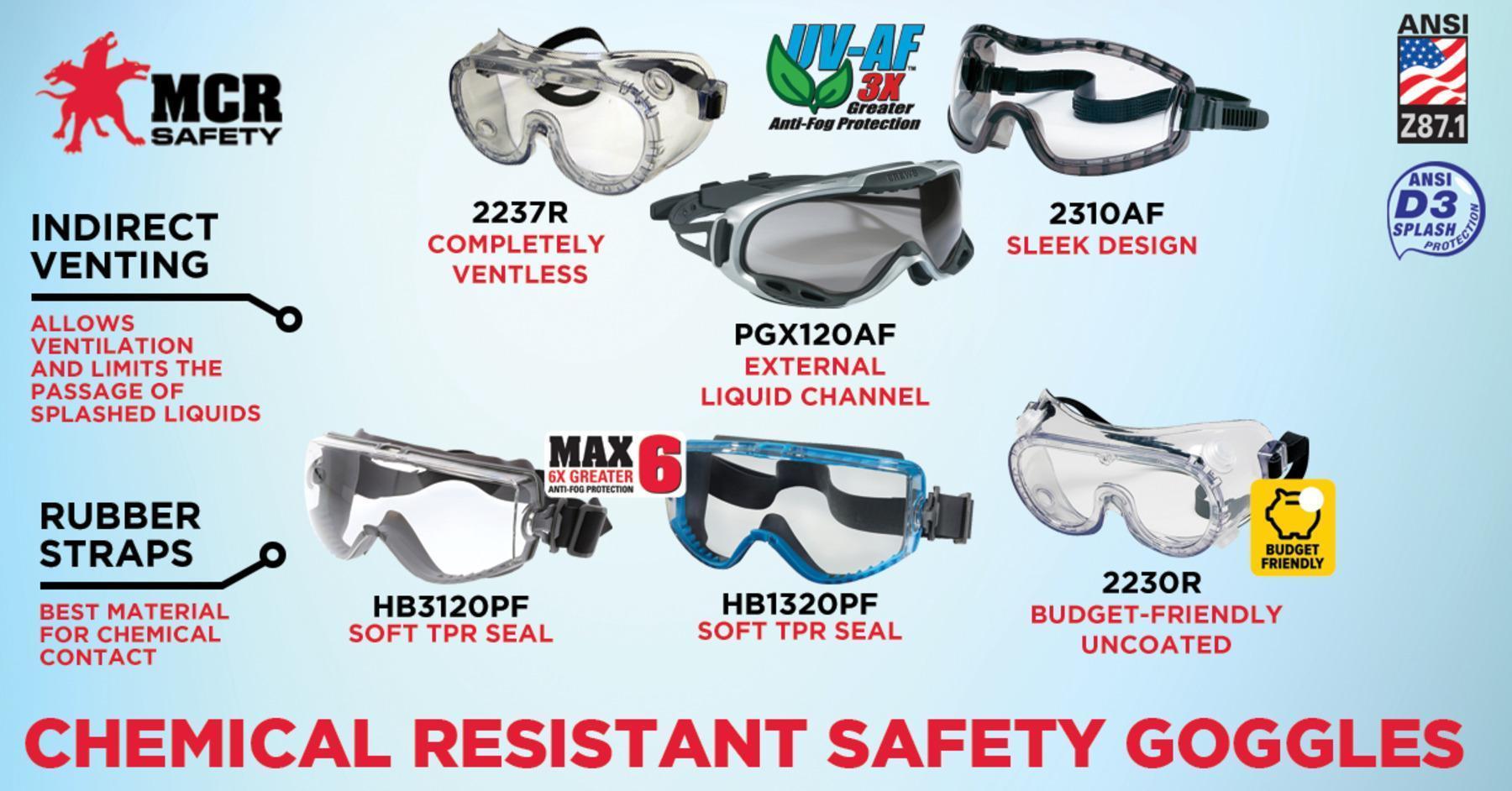24 Series Safety Goggles with Clear Lens Adjustable Head Strap Dielectric, Contains no Metal Fits over most prescription glasses The body design of the 24 Series goggles provides a wide, unobstructed field of vision and can be worn with most half-mask respirators. The transparent protective PVC body permits a comfortable fit over prescription eyewear. The flexible elastic or rubber headbands are adjustable, allowing them to fit most individuals comfortably. These goggles are designed with indirect ventilation, allowing airflow while significantly reducing the occurrence of splash from entering the goggle. Foam lined options available. If you are looking for the best safety goggles, choose MCR Safety! This product meets the ANSI/ISEA Z87.1-2025 standard.