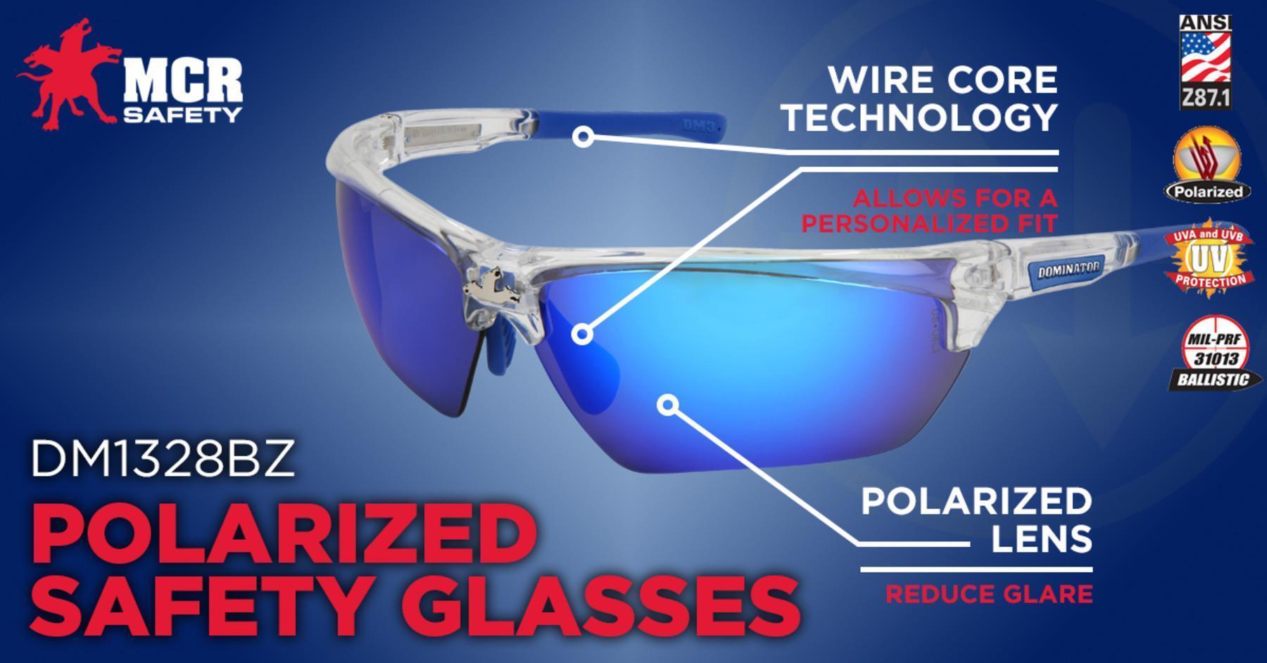MCR Safety DM1328BZ Dominator™ DM3 Premium Dual Lens Safety Glass, BossMan™ Mirror Duramass® HC, Blue Diamond Mirror Polarized Lens, Clear, Polycarbonate Frame, ANSI Z87+, MIL-PRF-31013