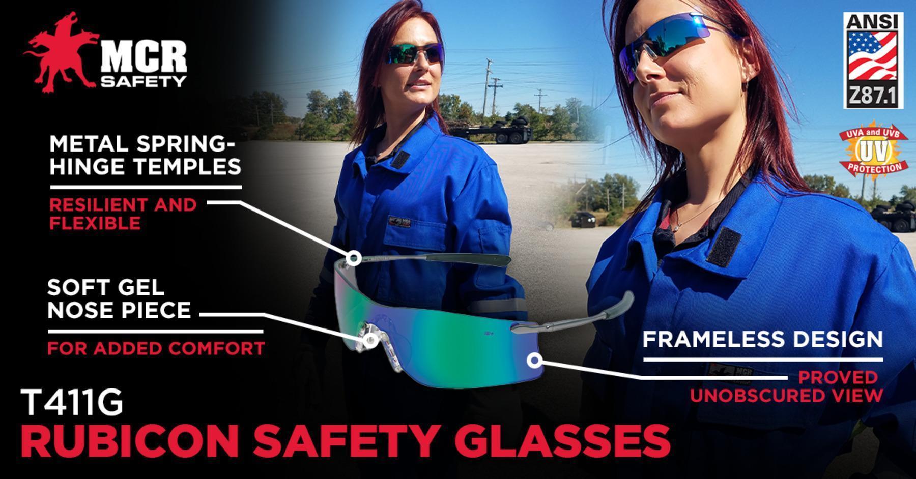 Rubicon® T4 Series Curved Frameless Lens Design Soft TPR Nose Piece Non-Slip Temple Material Resilient spring hinge temples for comfortable fit The Rubicon® T4 series curved frameless lens design offers a close orbital seal for increased protection, a soft gel nose piece for added comfort, and durable metal temples with non-slip, soft temple material. The frameless design keeps your line of vision clear, helping you focus on the task at hand. These high-quality safety glasses have a lifetime frame warranty and are engineered to provide the highest level of innovation for consumers who demand the very best. Choose the best safety glasses, choose MCR Safety! This product meets the ANSI/ISEA Z87.1-2025 standard.
