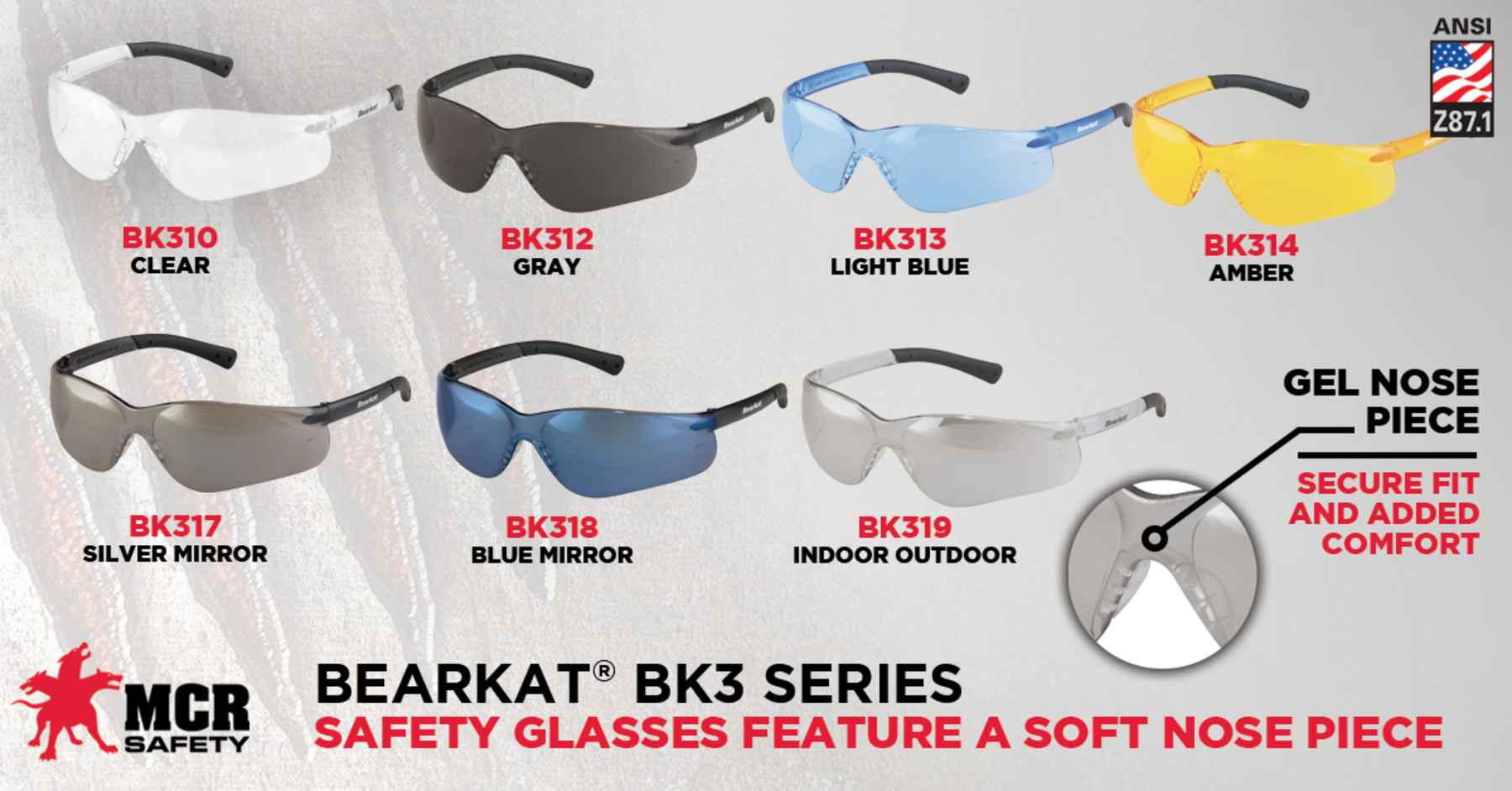BearKat® BK3 Series Safety Glasses with Soft Nosepece Non-Slip Temple Material Wrap around frameless lens design provides an unobstructed view The BearKat® BK3 features a soft, secure gel nosepiece for additional comfort. This series combines the best in safety, comfort, and affordability! Your vision is unobstructed by the one-piece wraparound lens, and its secure fit provides maximum safety. Comfort is enhanced by the flexible temples and the non-slip temple sleeves, which are notched for a clip-on breakaway cord! Choose the best safety glasses, choose MCR Safety! This product meets the ANSI/ISEA Z87.1-2025 standard.