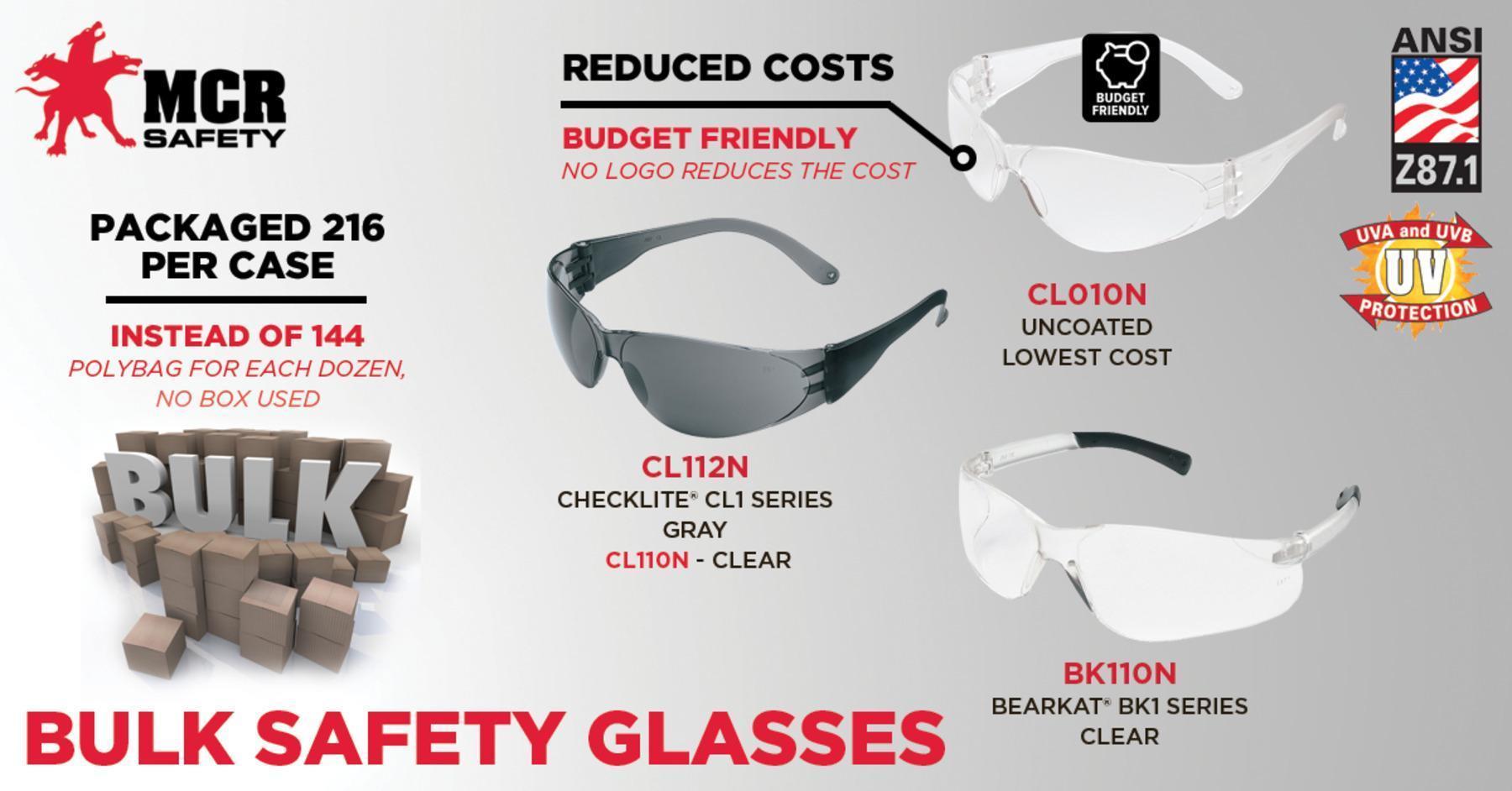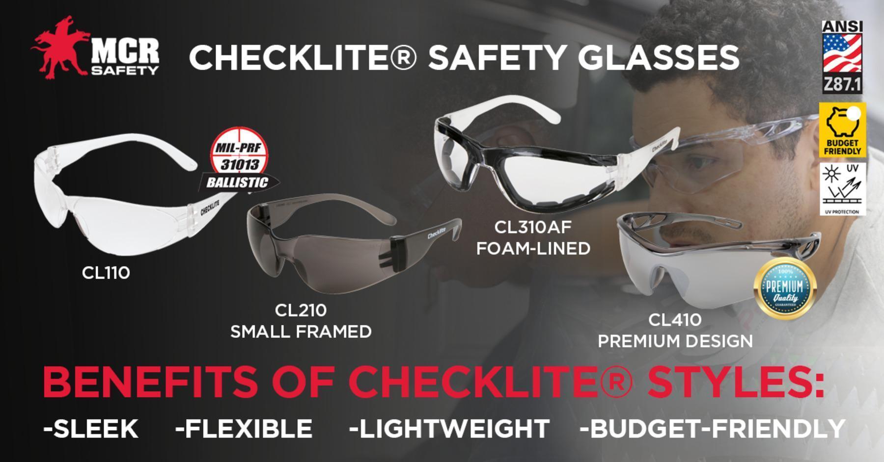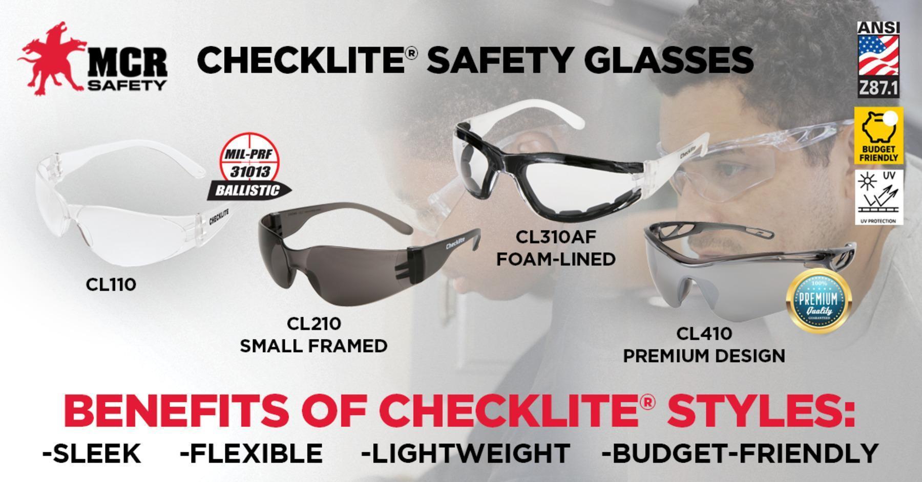 Checklite® CL1 Series Safety Glasses No Logos on Eyewear Lightweight glasses (22.9 grams) Smaller frame sized to fit smaller faces Excellent Orbital Seal and Fit Packaged 12 pair to a polybag to reduce corrugated packaging This lightweight option gives you a comfortable feel and keeps you safe while looking good! The Checklite® CL1N series has no logo and features a spatula temple and a frameless design that provides an unobstructed line of vision so you can stay busy on the job. Get the look you want at a reasonable price with the Checklite® CL1N series. Choose the best safety glasses, choose MCR Safety! This product meets the ANSI/ISEA Z87.1-2025 standard. CL010N and CL110N pass MIL-PRF-32432 standards.