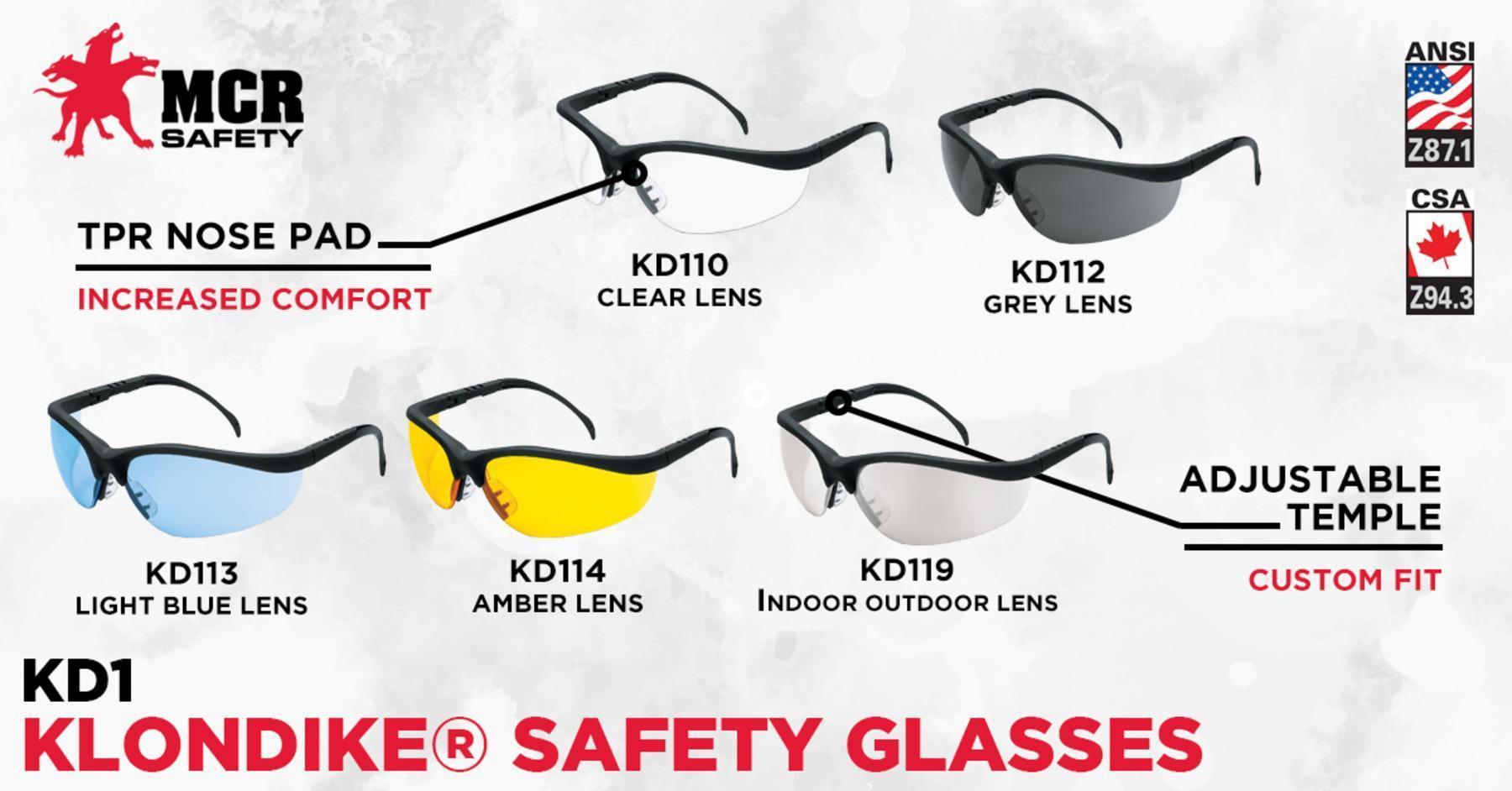 Klondike® KD1 Series Soft secure TPR Nose Pad Full orbital seal with dual lens design Adjustable temple length The Klondike® KD1 glasses feature safety and style at an affordable price to separate you from the pack. Whether on the slopes or in the workplace, the matte black frame finish, adjustable temple length, and soft, secure TPR nose pad keep you at the peak of comfort and style all day. Multiple lens and frame options are available. Choose the best safety glasses, choose MCR Safety! This product meets the ANSI/ISEA Z87.1-2025 standard.