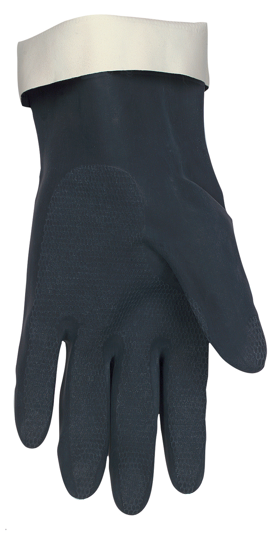 Chem-Tech™ Neoprene over Latex Gloves Yellow Flock Lined Latex Dipped in Blue Neoprene 28 mil Thickness 12 Inch Length Component materials comply with all federal regulations for food contact Chem-Tech™ gloves offer the protection you've come to expect from latex gloves and neoprene gloves rolled into one hard-working glove. This glove features a yellow flock-lined latex glove dipped in rugged blue neoprene for double protection. The 5409S is 28 mils thick and measures 12 inches in length. It has a raised diamond grip pattern on the palm, palm side fingers, and thumb, increasing griping power. Other features include a straight cuff and straight thumb. Are you looking for the best flock-lined gloves? Look no further than MCR Safety! This product contains natural rubber latex which may cause allergic reaction to those with latex allergies.