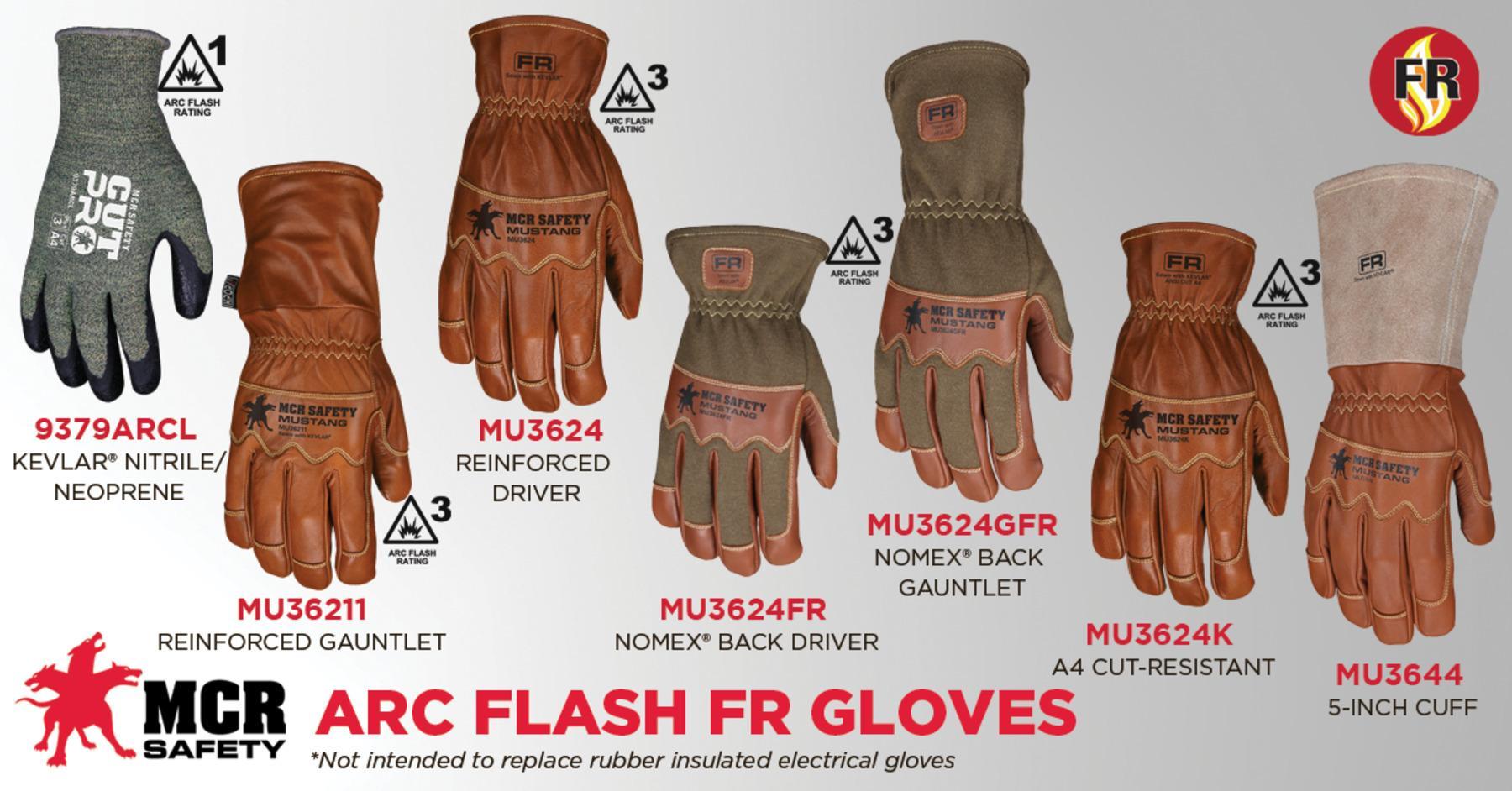 Mustang Leather Drivers Utility Work Gloves Premium A Grade Grain Goatskin Double Palm, Unlined Sewn with DuPont ™ Kevlar ® Sewn Wing Thumb This FR Glove has an Arc rating of 28.6 Cal/cm 2 The men and women who work in the electrical industry need gloves that match their hard work and dedication. Therefore, they rely on the industry leader to provide the best hand protection for them. The MCR Safety Mustang Utility field glove, made from top grain leather, provides the required dexterity to feel what you are working with while holding up well against abrasion. The MU3624 gloves feature premium A grade brown goatskin leather, a reinforced thumb crotch, double palms, fingertips, and knuckles. They are sewn with DuPont™ Kevlar® thread and have shirred elastic around the wrists and a comfortable wing thumb design. With an ARC rating of ATPV 28.6 cal/cm2 (HRC3 / CAT3) and a heat attenuation factor (HAF) of 94%, these gloves are safe and reliable. For the best leather glove options, choose MCR Safety.