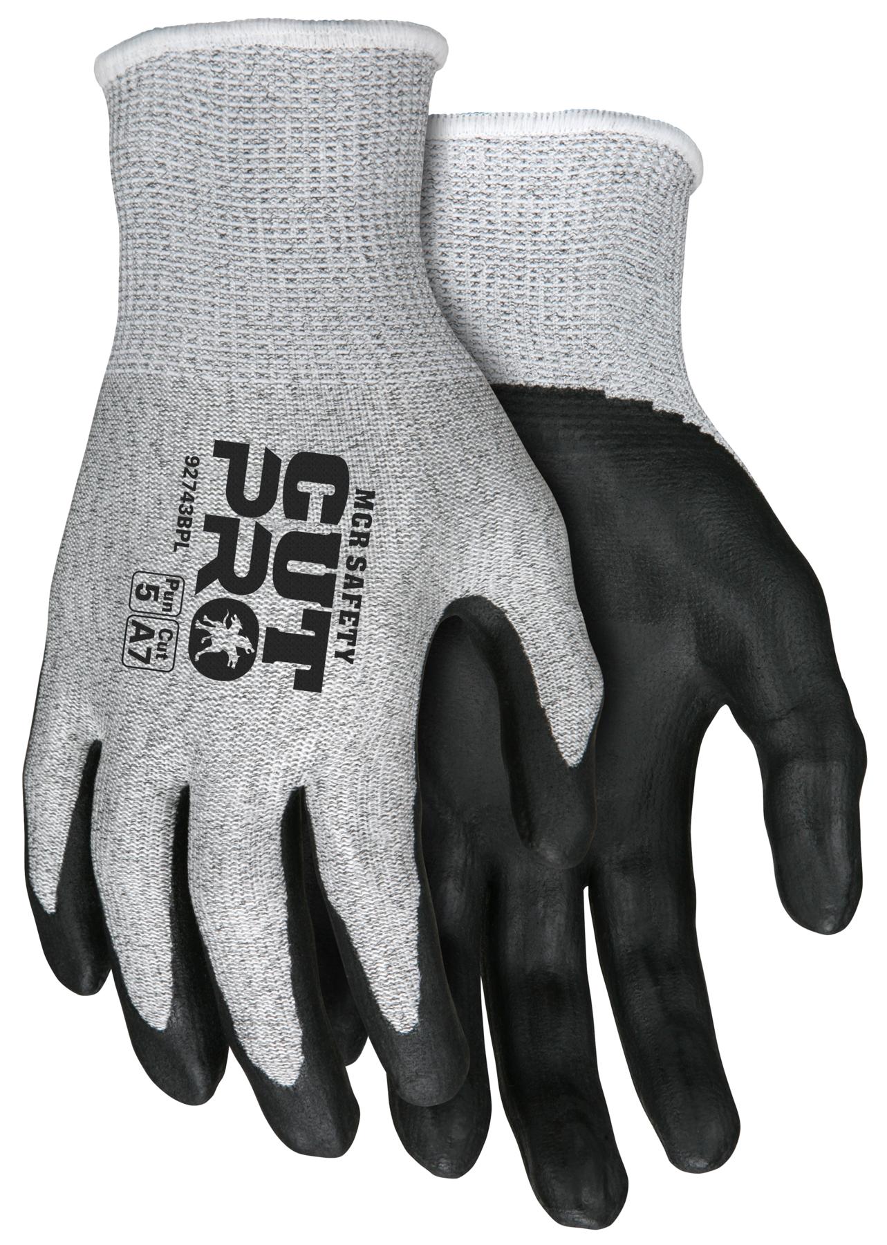 MCR Safety CutPro® 13-Gauge HyperMax® HPPE Shell Cut, Abrasion, and Puncture Resistant Work Gloves Bi-polymer Coated Palm and Fingertips Reinforced thumb crotch The MCR Safety CutPro® 92743BP features a reinforced thumb crotch for added durability. It also provides a seamless salt & pepper HyperMax® HPPE shell that supplies superior cut, tear, and abrasion resistance. The black foam nitrile and water-based PU-coated palm and fingertips provides good gripping ability and hides dirt, grit, and grime. With high cut, abrasion, and puncture-resistant scores, this glove keeps coming back for more. If you are looking for the best cut-resistant gloves, look no further than MCR Safety's CutPro® series cut-resistant options. (Vending packaged option = VP92743BP ).