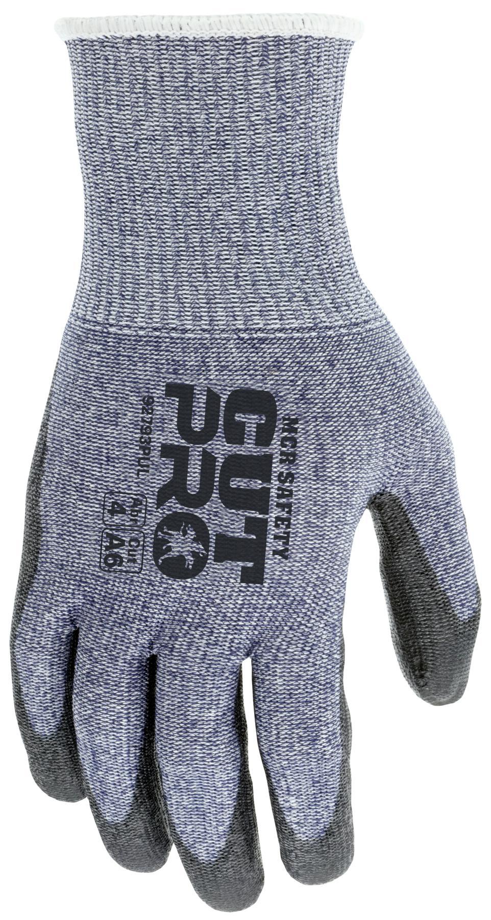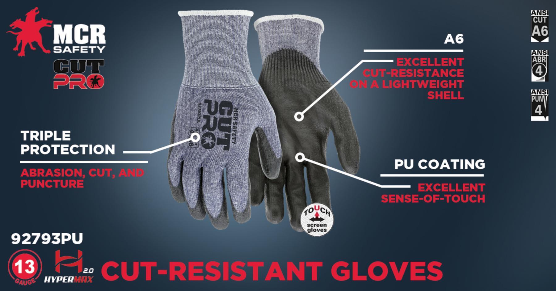 MCR Safety CutPro® 13-Gauge HyperMax® HPPE Shell Cut, Abrasion and Puncture Resistant Polyurethane (PU) Coated Palm and Fingertips PU coated palm on HyperMax® HPPE shell for excellent cut and abrasion resistance The MCR Safety CutPro® series offers various cut protection levels and materials. The 92793PU work gloves feature a 13-gauge blue HyperMax® HPPE shell with a black polyurethane (PU) coating. These gloves not only offer outstanding grip but also provide great flexibility that helps to limit hand fatigue on long, hard-working days. The 92793PU offers a seamless gray HPPE/synthetic shell with exceptional cut, tear, and abrasion resistance. It is also touchscreen-friendly for phones, pads, and other devices. If you are looking for the best cut-resistant gloves, look no further than MCR Safety's CutPro® options.