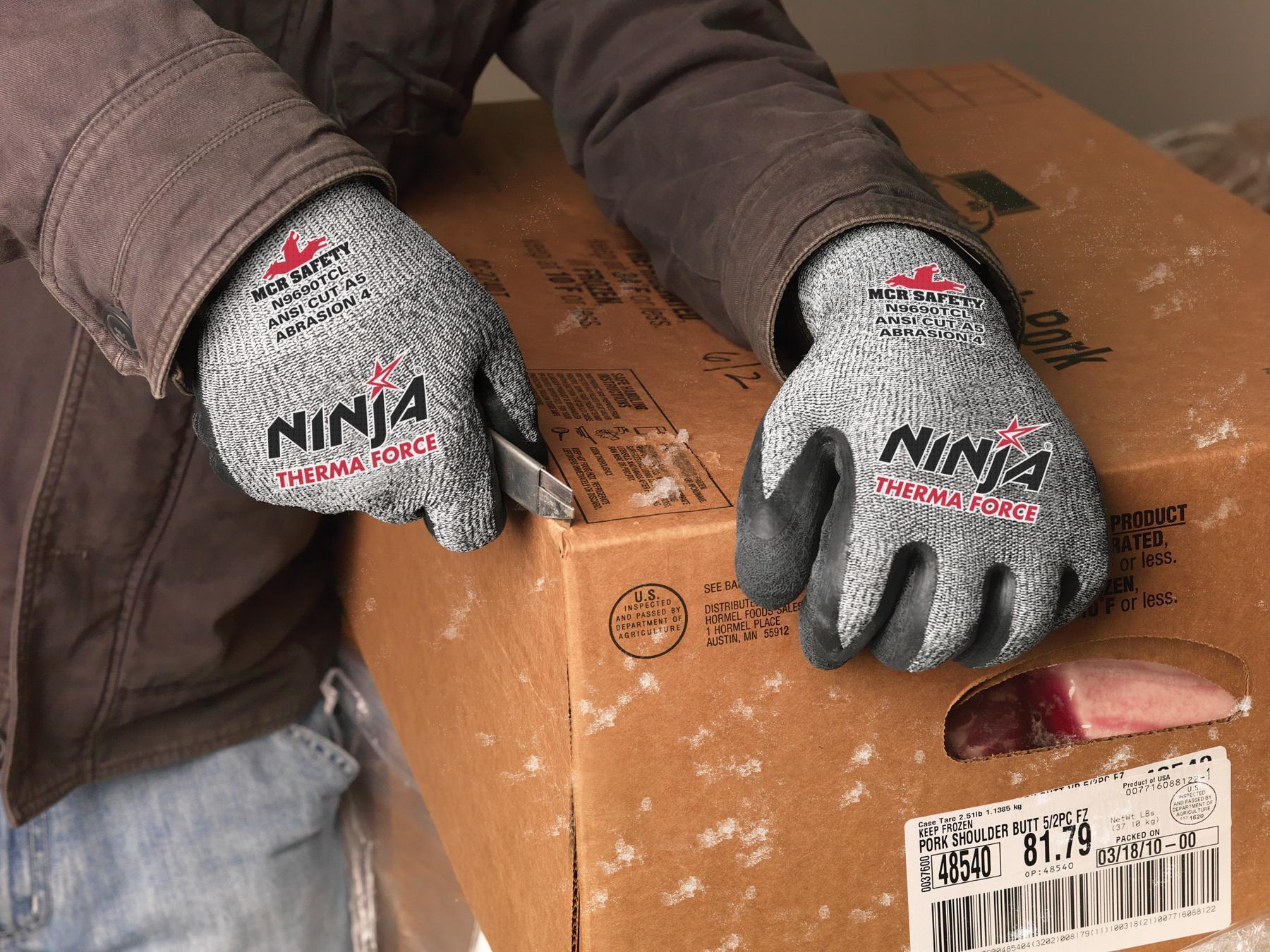 MCR Safety Ninja® gloves are engineered to provide the highest level of innovation. Each of the offerings in the Ninja® series include a unique shell and polymer combination incorporating the latest in hand protection technology. Our Ninja® Glove Line offers the greatest assortment of dexterity, sense of touch, and protection. The Ninja® Therma Force features a 13 gauge gray Dyneema®/Synthetic exterior with an acrylic terry interior liner. Black bi-polymer coated palm and fingertips.