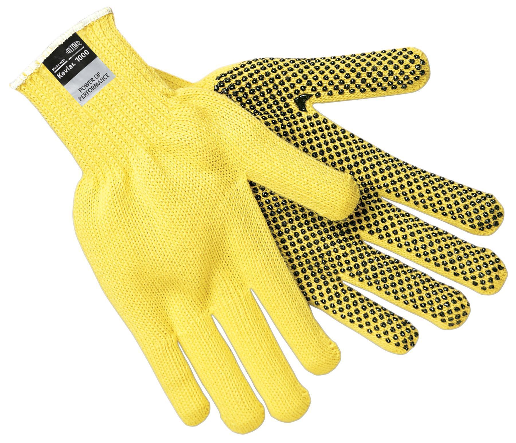 Kevlar® string knit gloves are used for general purpose work applications to provide cut and abrasion resistance, using high performance yarns, to further protect the hands when working with sharp objects. The 9365 features 100 percent Kevlar® regular weight fibers that is dotted on one side with black PVC dots.