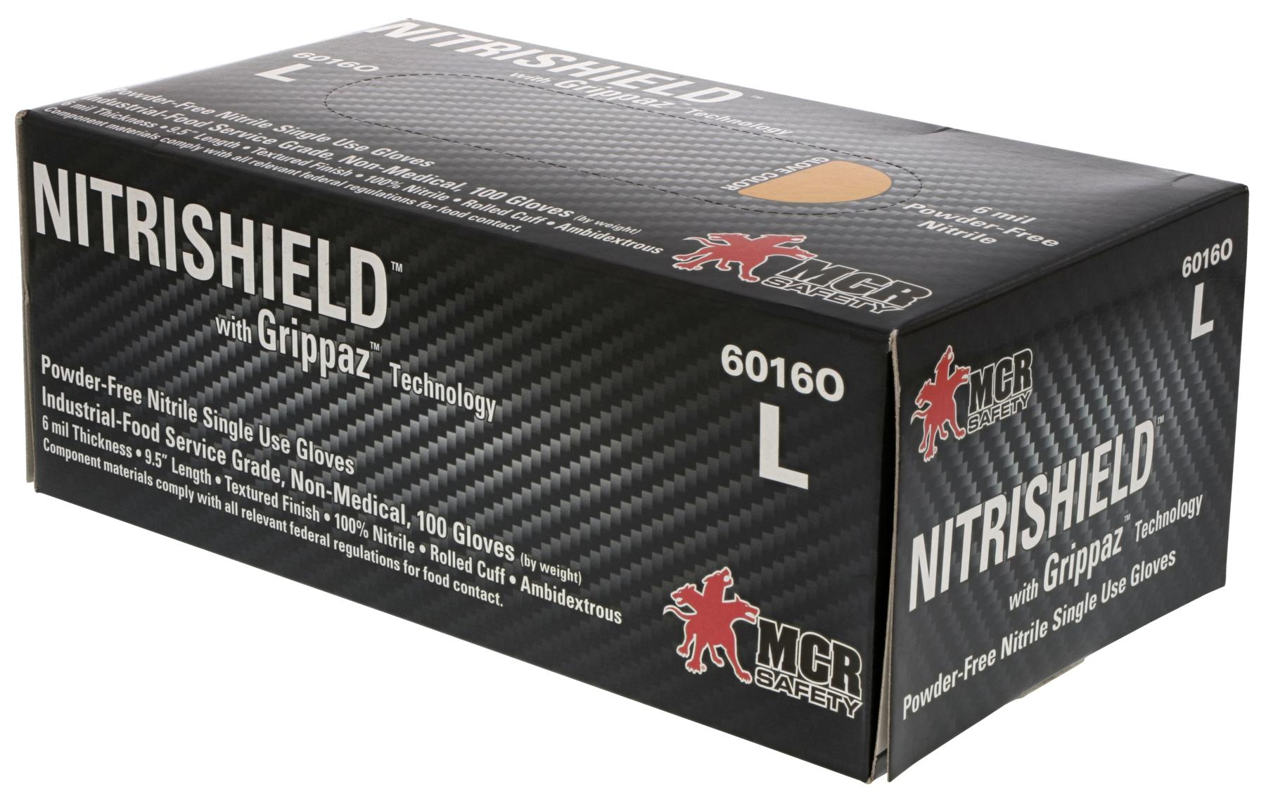 Introducing NitriShield® with Grippaz™ technology. Grippaz™ single use gloves feature a patented suction grip design which is suitable for most wet and greasy surfaces. The embossed internal grip provides extra traction which keeps the gloves from slipping against the skin. The lattice effect of the grip drastically increases the overall tensile strength which increases the overall durability. Every Grippaz™ glove is designed with the wearer in mind. Each thumb contains the fish scale pattern as found on hand specific coated gloves which truly provides a firm grip when wearing Grippaz™ single use gloves. NitriShield® with Grippaz™ technology are designed to cover a broad spectrum of industrial uses including automotive, assembly, paint spraying, electro plating, cleaning, asbestos removal and janitorial.