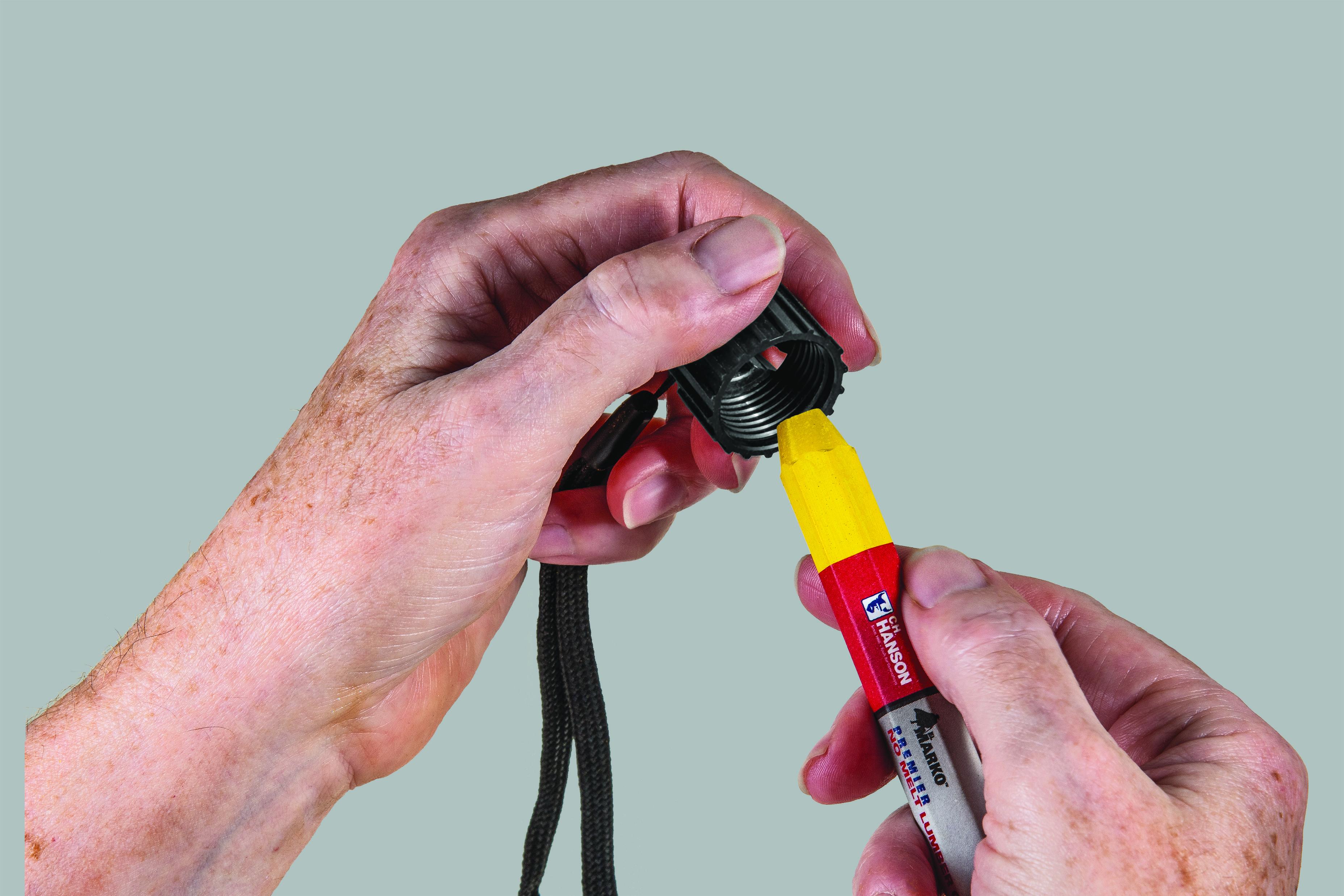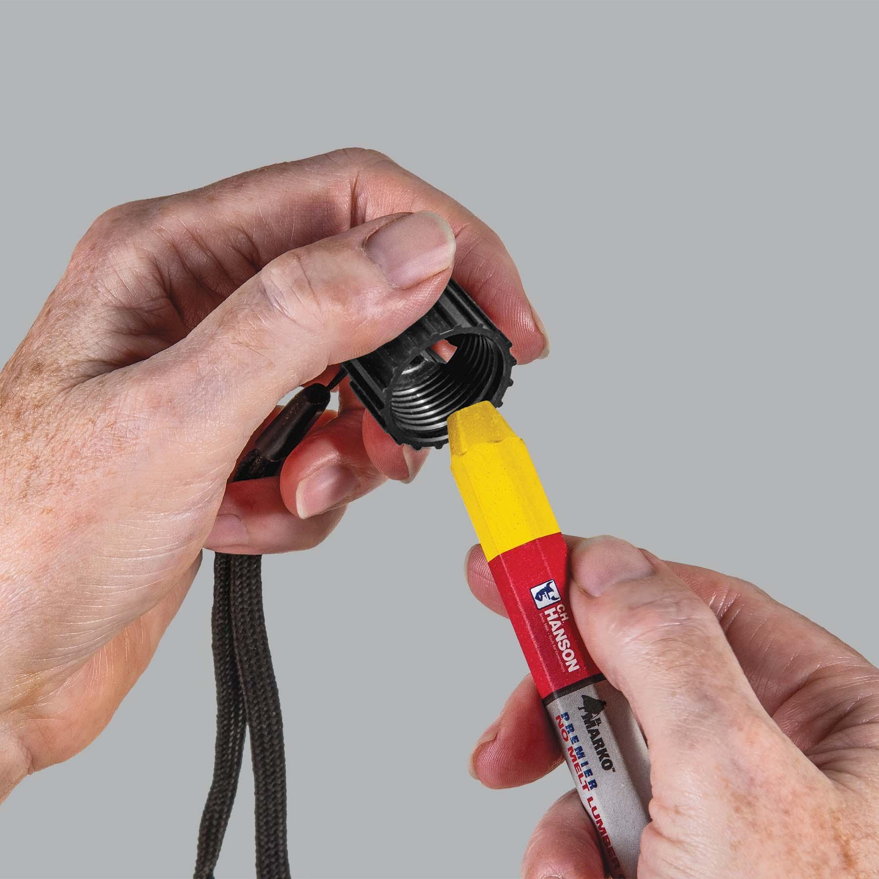Knurled collar securely holds crayons. Wooden housing prevents crayons from breaking. Crayon sharpener built into the cap. Allows use of full crayon. Lanyard strap design for quick access. Patent pending.