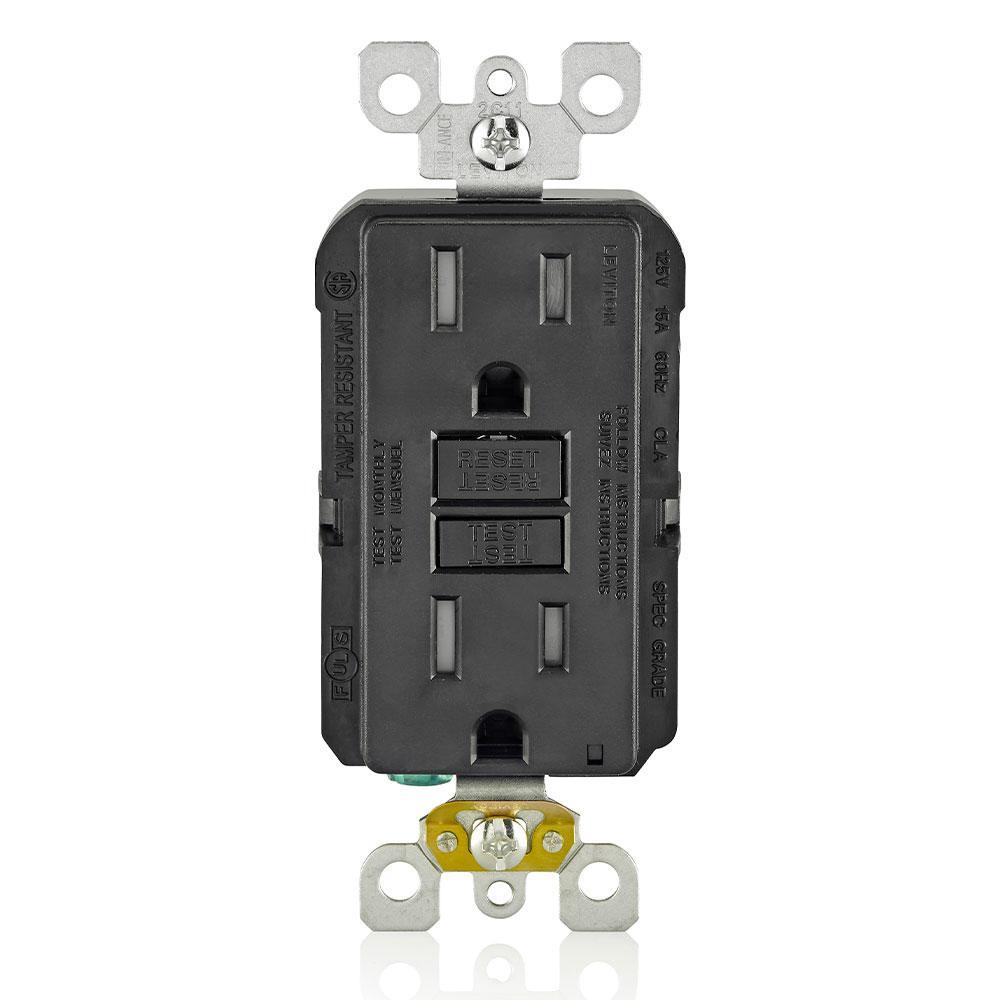 Leviton® SmartlockPro® GFTR1-E Feed Through Self-Test Slim Standard Duplex Tamper Resistant GFCI Receptacle With Black Test and Reset Button, 125 V AC, 20 A, 2 Poles, 3 Wires, Black