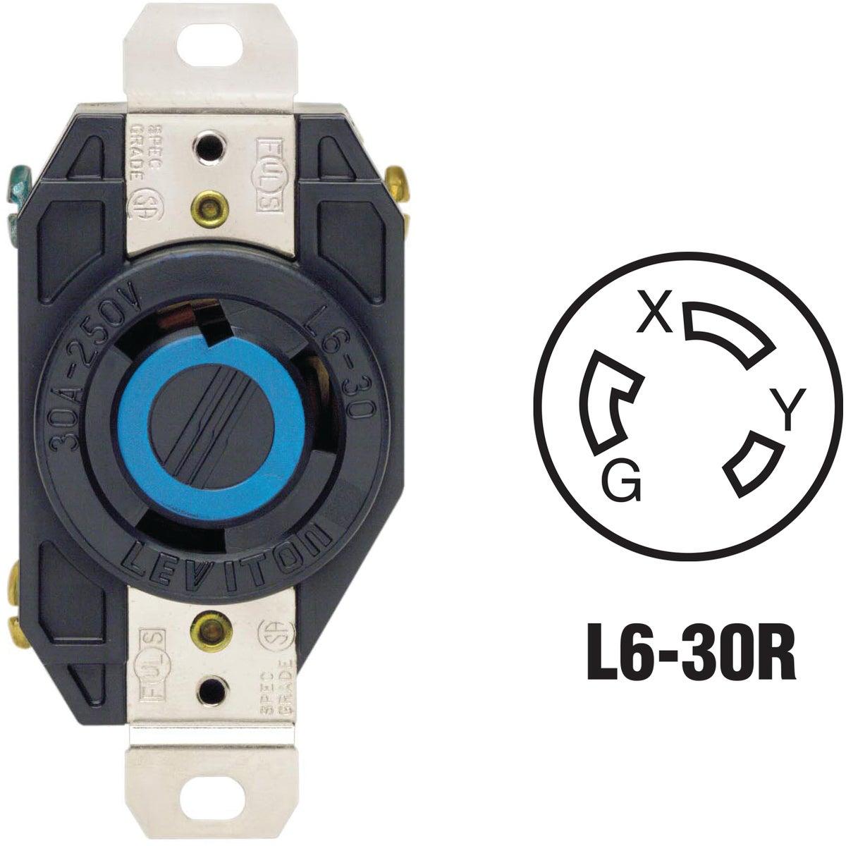 Leviton® 2620 Grounding Locking Receptacle, 250 V AC, 30 A, 2 Poles, 3 Wires, Black